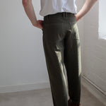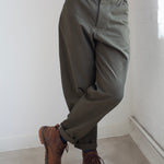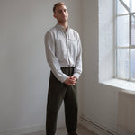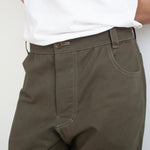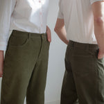 The Worker Trousers are a roomy and generous cut that should sit comfortably on the waist, feel slightly more roomy on the hips and even more roomy around the thighs.