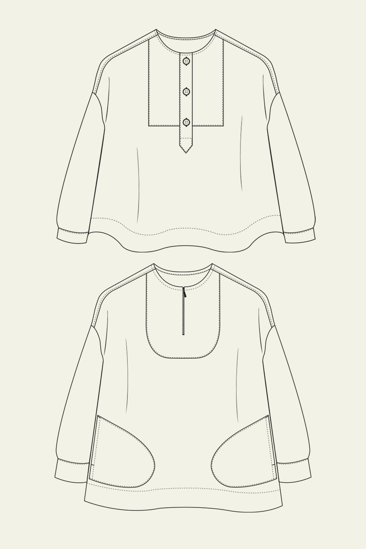 The French Smock is a casual classic that comes with a huge range of design options which include: a button up placket OR zip fastening, different bib shapes, an optional trim for the curved bib, optional patch pockets, 2 different lengths and options for thick or thin fabrics for the cuff, sleeve placket and neck binding (thin fabrics can use the smaller pattern pieces, thicker fabrics will want to use the wider pattern pieces.