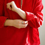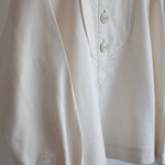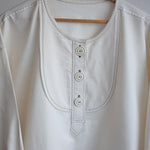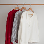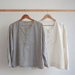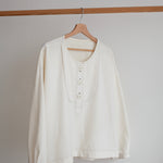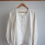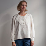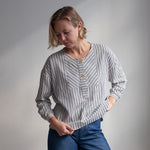 The French Smock has a slouchy square cut, dropped shoulders, neat sleeves, simple round neck. The sizing is particularly generous with this style as it needs to come on and off over the head.
