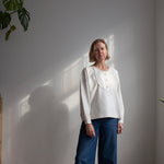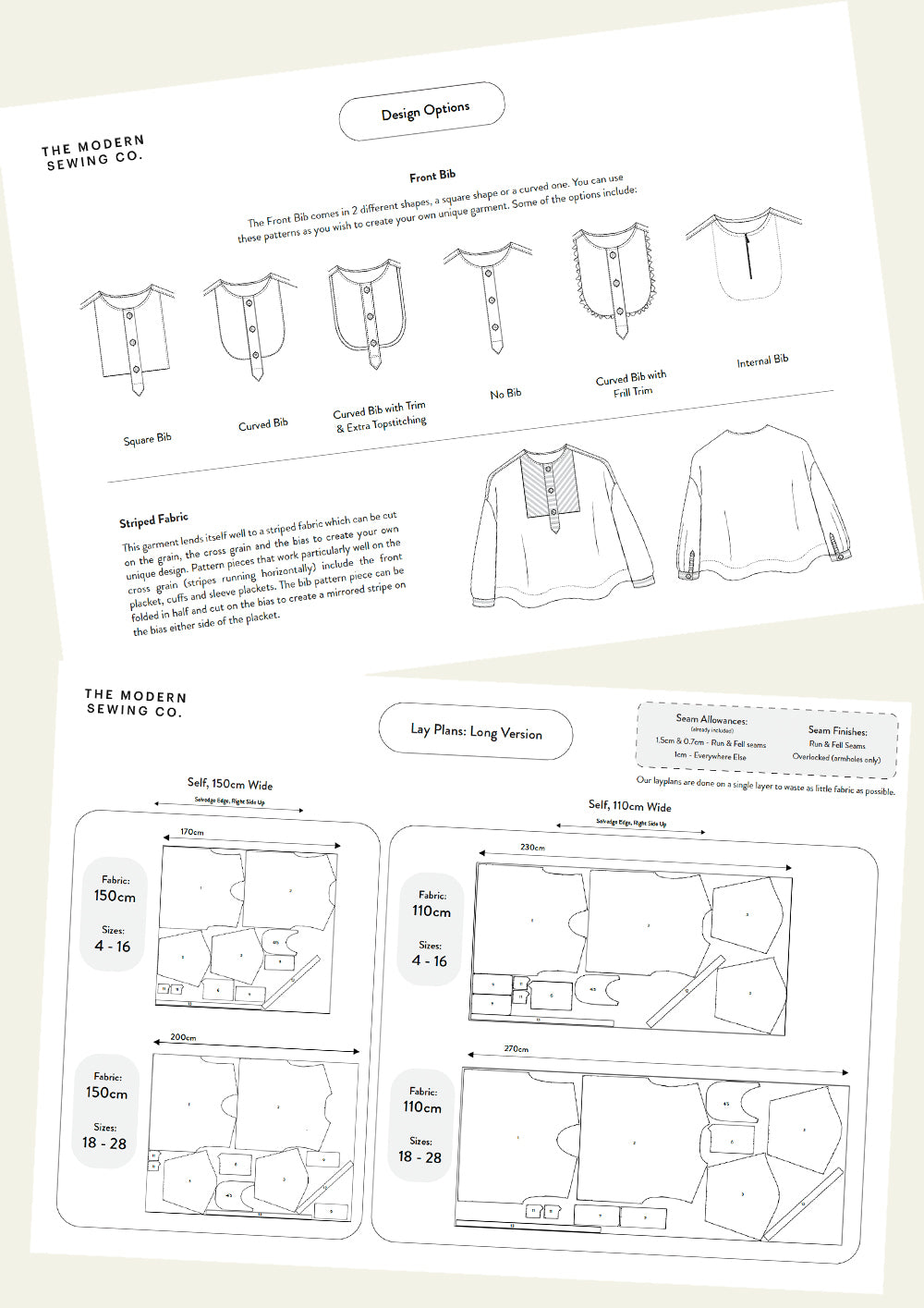 Construction techniques: Front button placket, optional zip fastening (for more experienced makers), full sleeve with cuff and plackets, flat binding, run & fell seams and topstitching details.