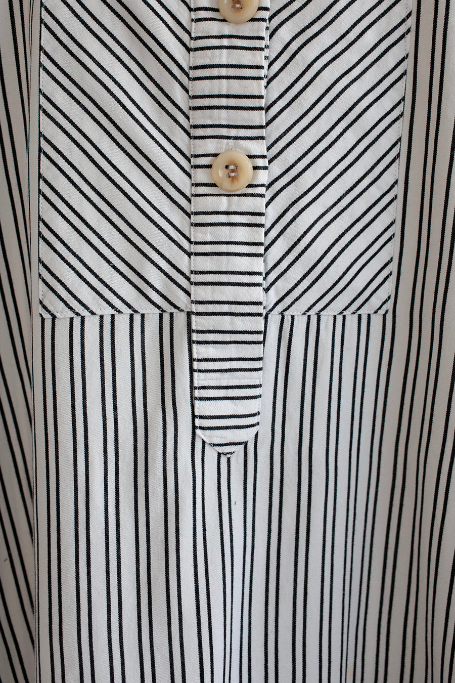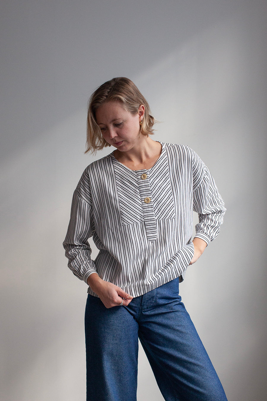 Otherwise, and I really want to emphasize this: the top was a real joy to sew and one of those "take your time and you will be rewarded" projects. I used a striped medium weight cotton shirting that looks very much like the sample here, which meant ultra precision was critical for the bib and plackets, and the results are beautiful. I used self-covered buttons which is the *chef's kiss*. The fit is oversized and I did size down two sizes and it's plenty loose without looking sloppy. I'm about 5'4" and reduced the sleeve by an inch so now it's a touch past my wrist bone, but works with the oversized fit. If you're buying the pattern now and you are a patient sewer, you're going to love it. If you bought the pattern before the summer, check for any updates first!