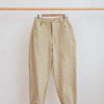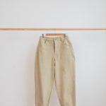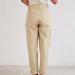 The Worker Trousers are slightly lower on the high waisted spectrum, sitting comfortably above the hip but not too high up the waist. They are cut to fit neatly on the body & hips and then flare slightly on the thigh and taper in again at the ankle.