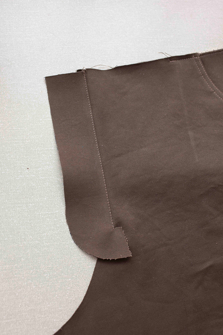 Lay your button stand on top of the RIGHT SIDE of your right hand trouser leg. Line up the pieces with the raw edges flush against each other. Stitch this down at 1cm, stopping right where the notch is.