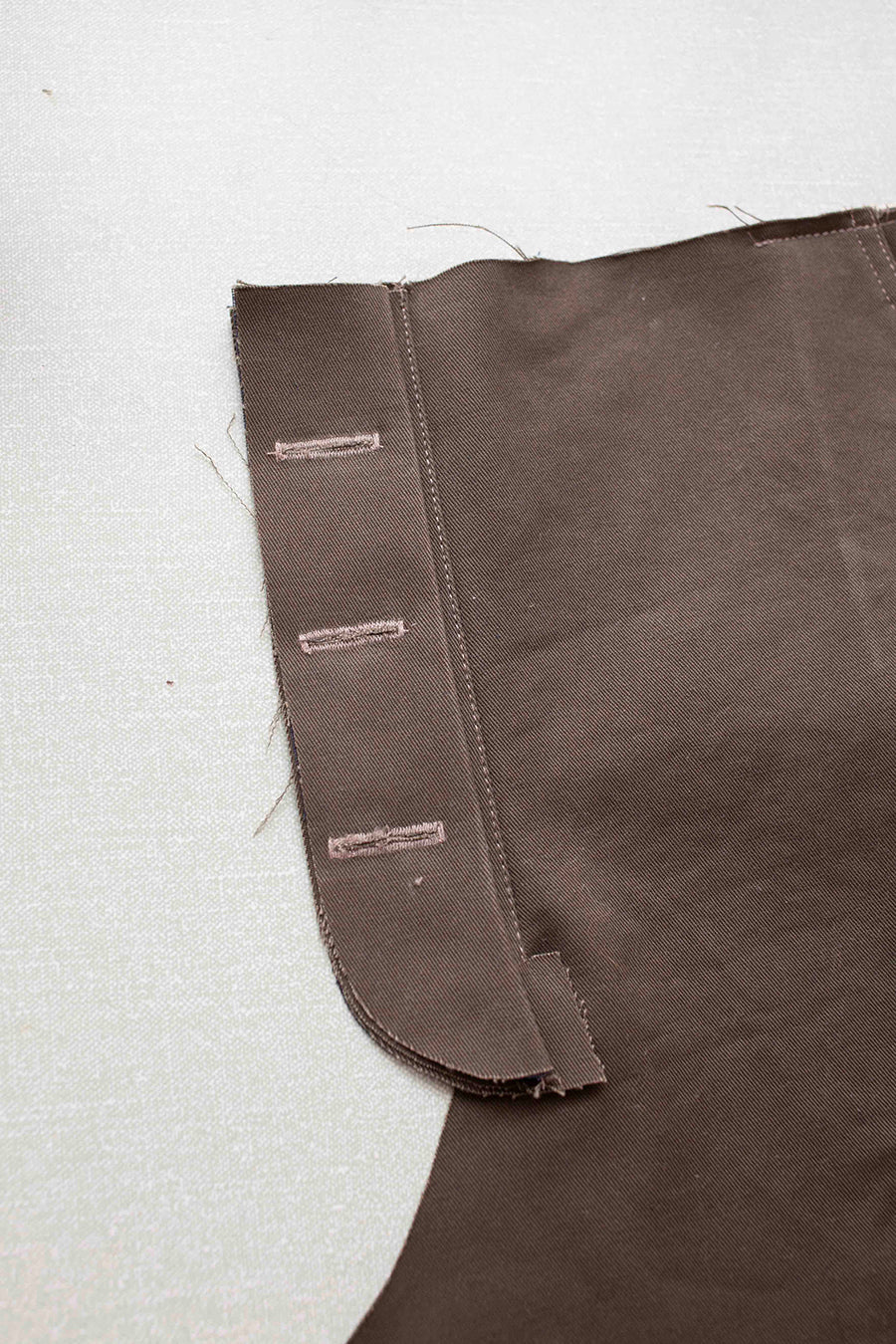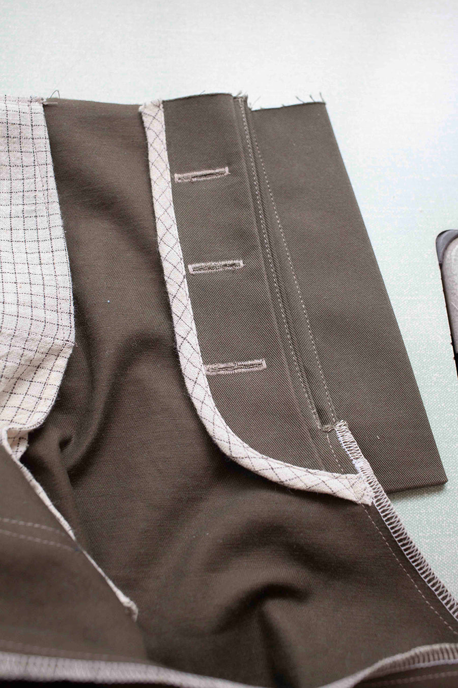 Check your button hole markings at this point and add your button holes to the fly stand.