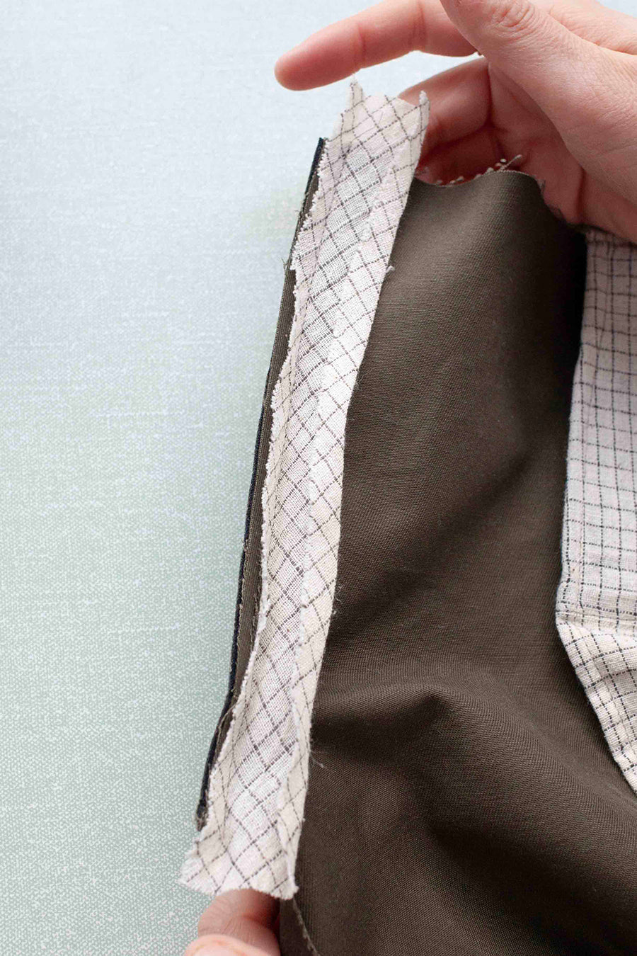 Now lay the front trouser flat and pin the facing flat against the front leg. From the inside of the trouser stitch around the curve of the facing nice and slowly to get a smooth stitch line. Sew right up to the crotch seam and do a good backwards stitch to finish. Make sure all other layers are pushed out of the way as you reach the front crotch seam.