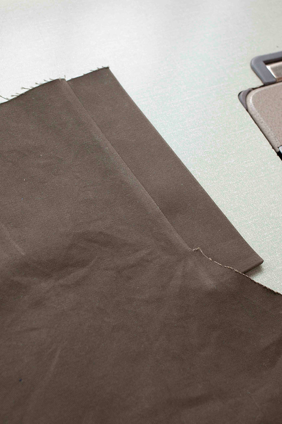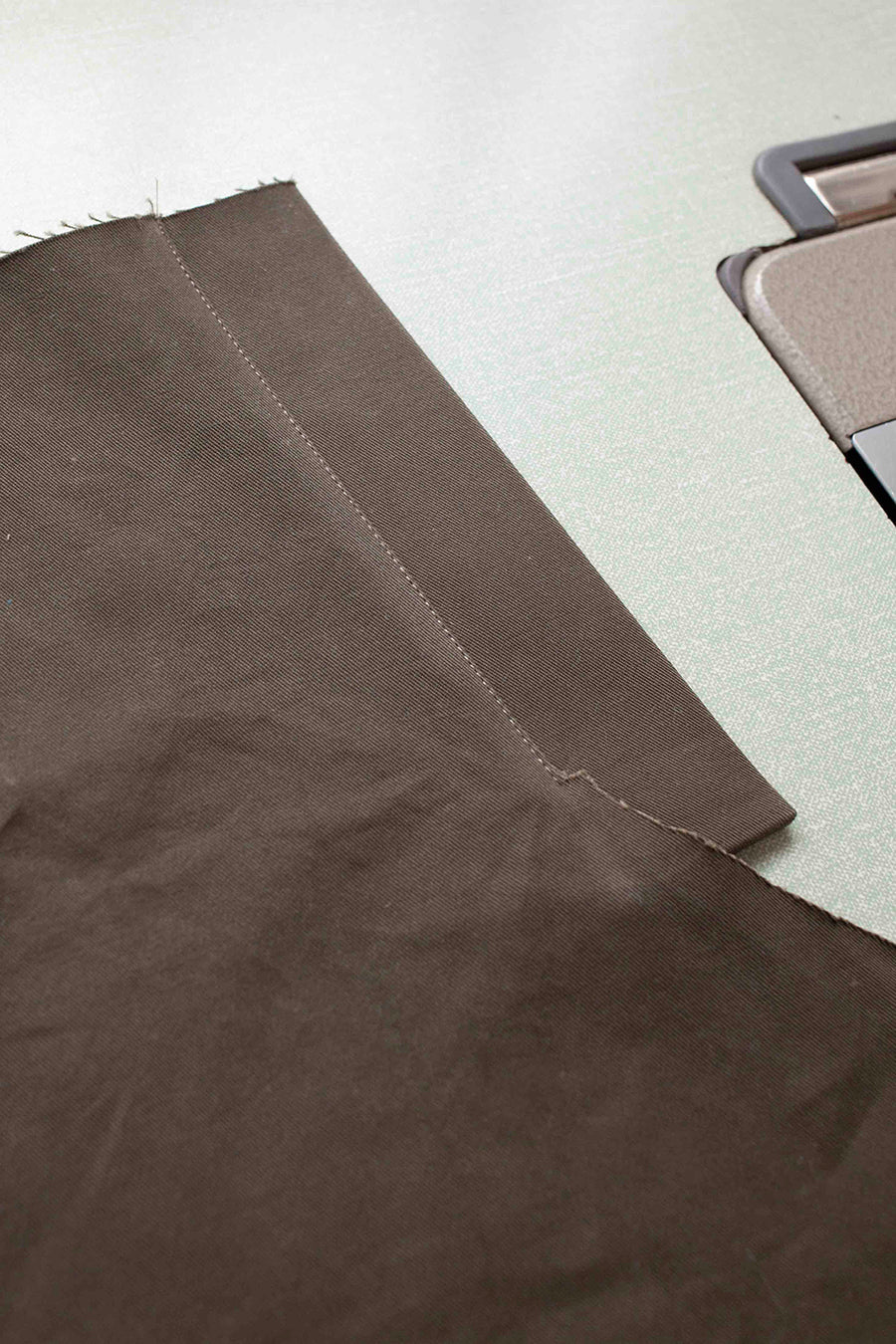 Then turn up the bottom end of the binding and then fold the rest of the binding over the raw edges to enclose the whole area. Take your time arranging the layers so you get a neat squared off section at the bottom. Edge stitch into place and then trim the excess binding at the top to sit flush with top of the leg.