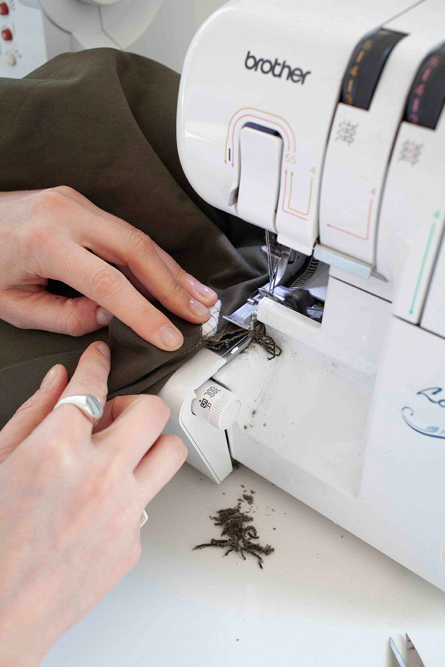 Then leave the needle down at the outer edge of the bar tack, swivel the trouser to the right and continue your 0.7cm topstitching around the crotch seam, making sure the overlocked seam is pushed to the right and sitting underneath the topstitching.