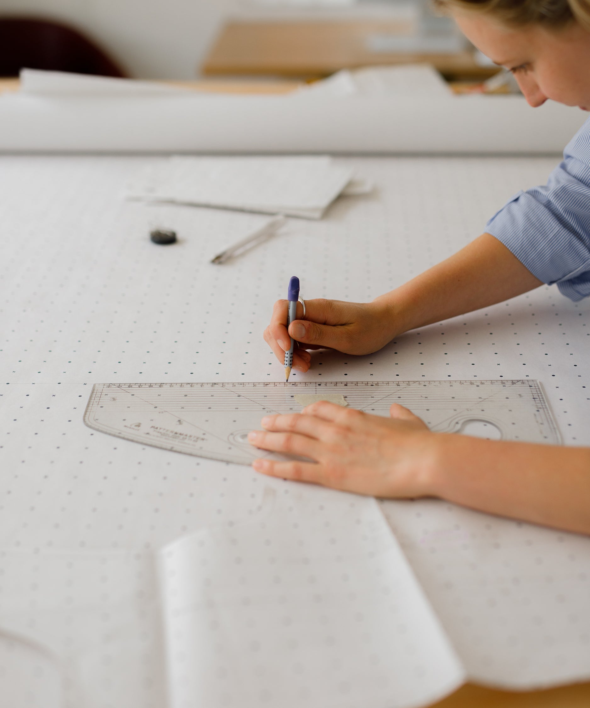 With training in pattern cutting I started this business drafting the patterns myself. My cuts are steered towards classic shapes with a touch of extra volume and a feel of casual tailoring. We now have extensive blocks that we can pattern cut from and with the business steadily growing we now also work with talented freelancers.