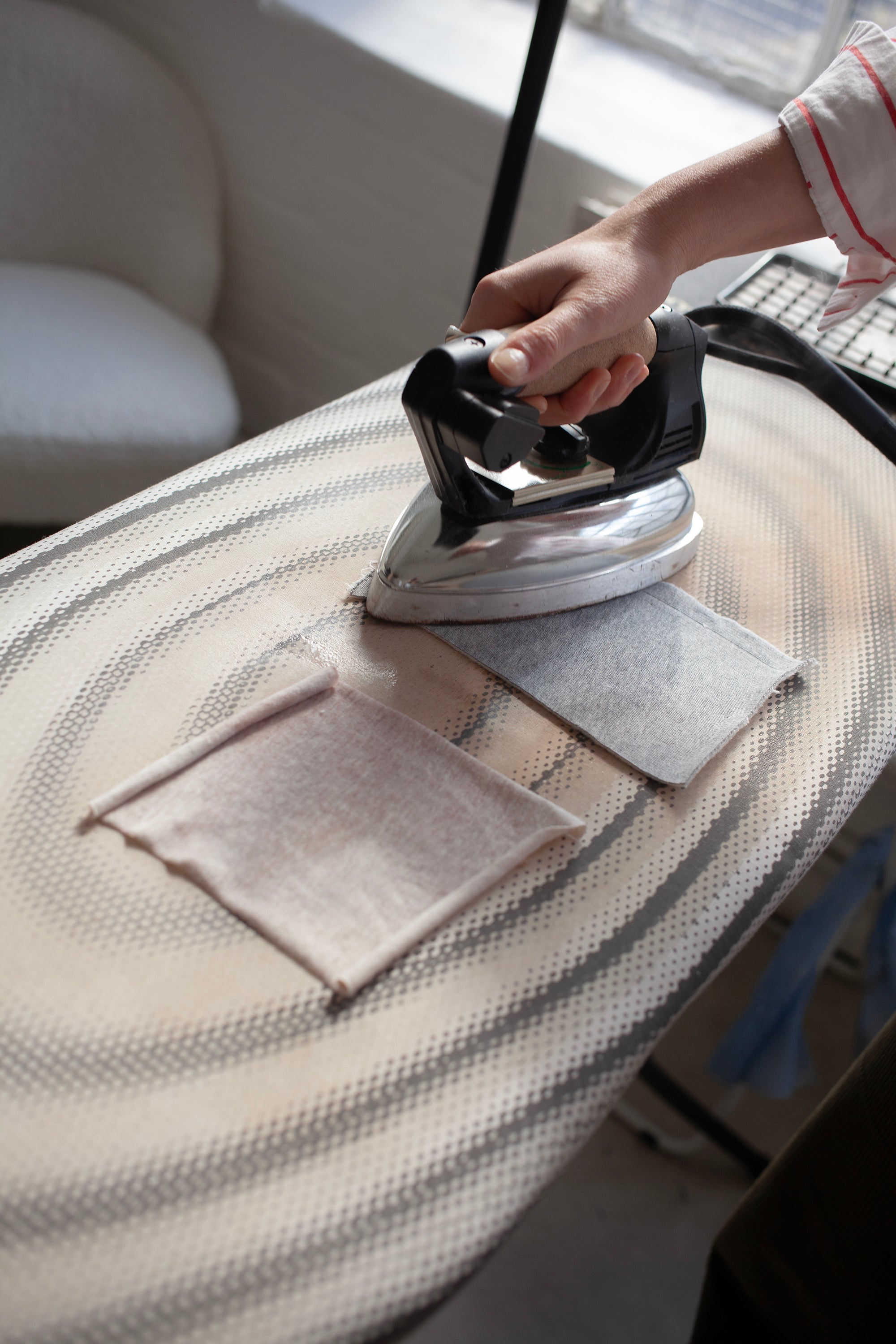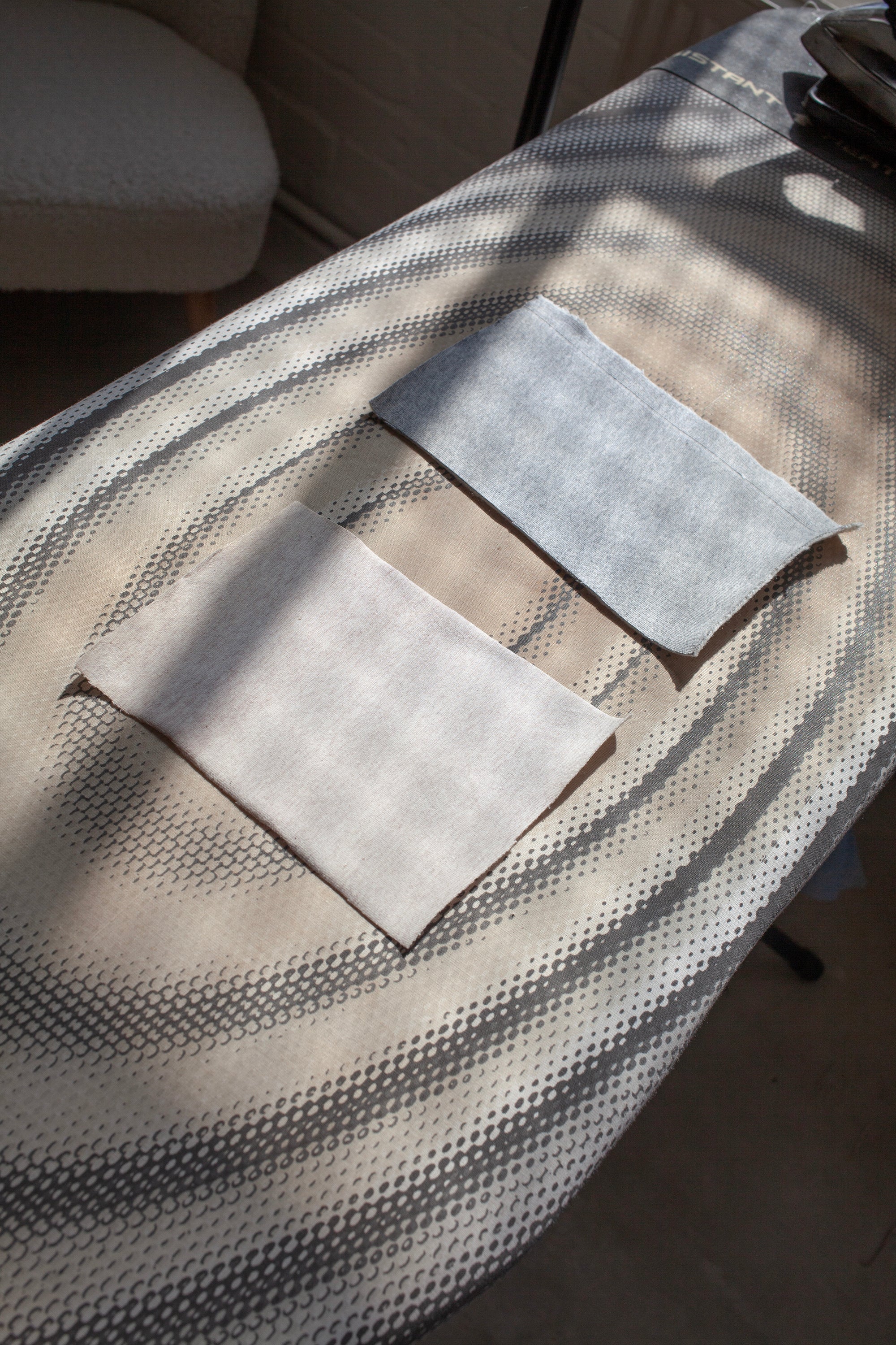 The lighter weight jersey on the left took a little longer to flatten, but worked perfectly when the iron was kept on until the spray was dry.