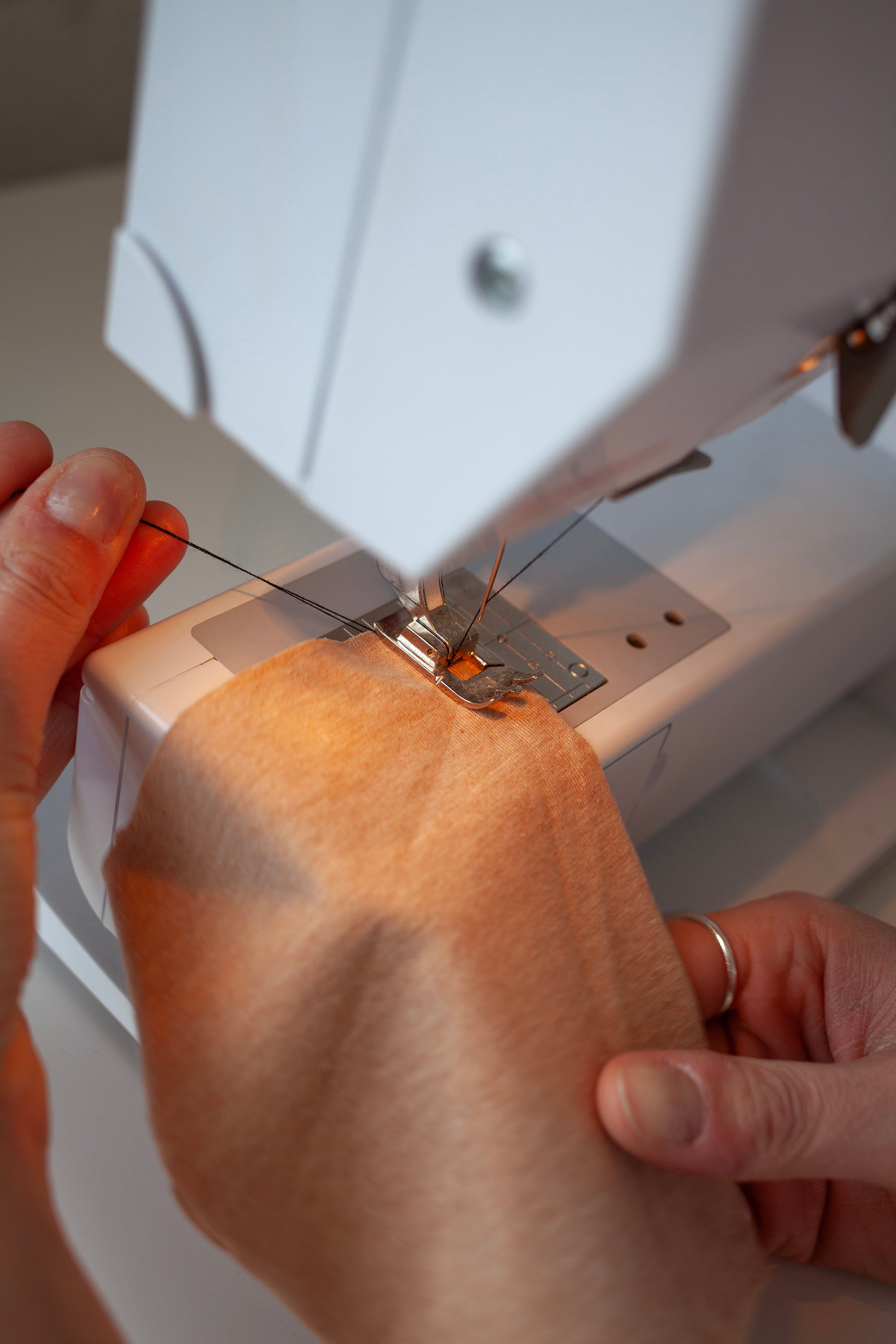 Sew a test seam and then stretch the jersey to make sure it doesn’t snap. It’s always best to re-test on each new jersey you sew, for example a thick jersey for a sweater might require a different stitch to a thin t-shirt jersey.