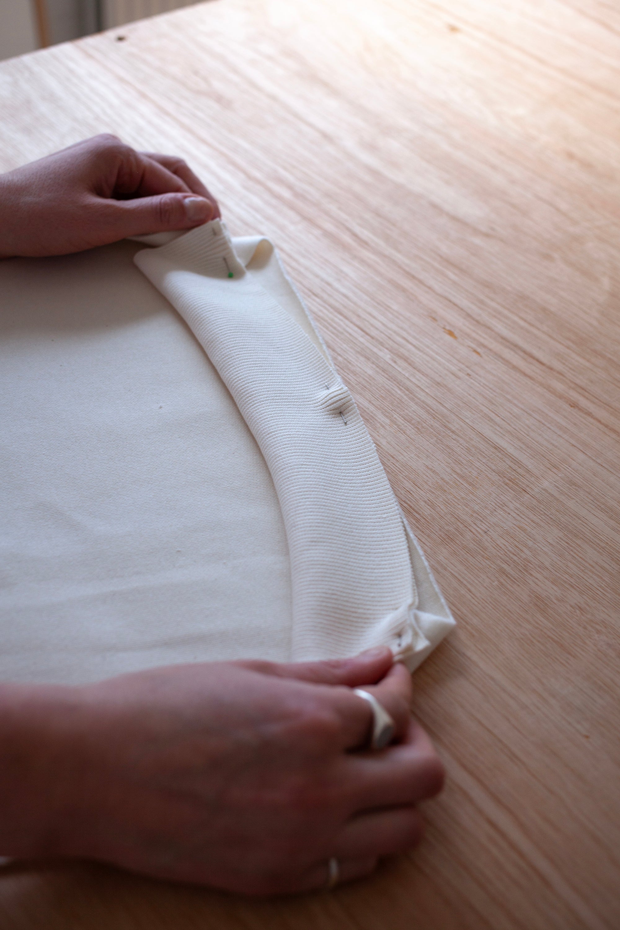 To sew the ribbing, pin it at one anchor point (this might be a seam or Centre Front/Centre Back notch) and then gently stretch it to distribute the volume evenly. Carefully pin it in place, re-stretching to check it.