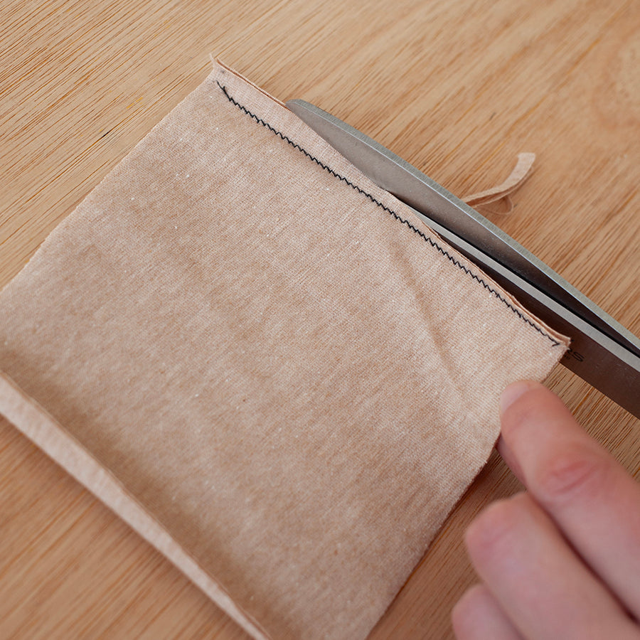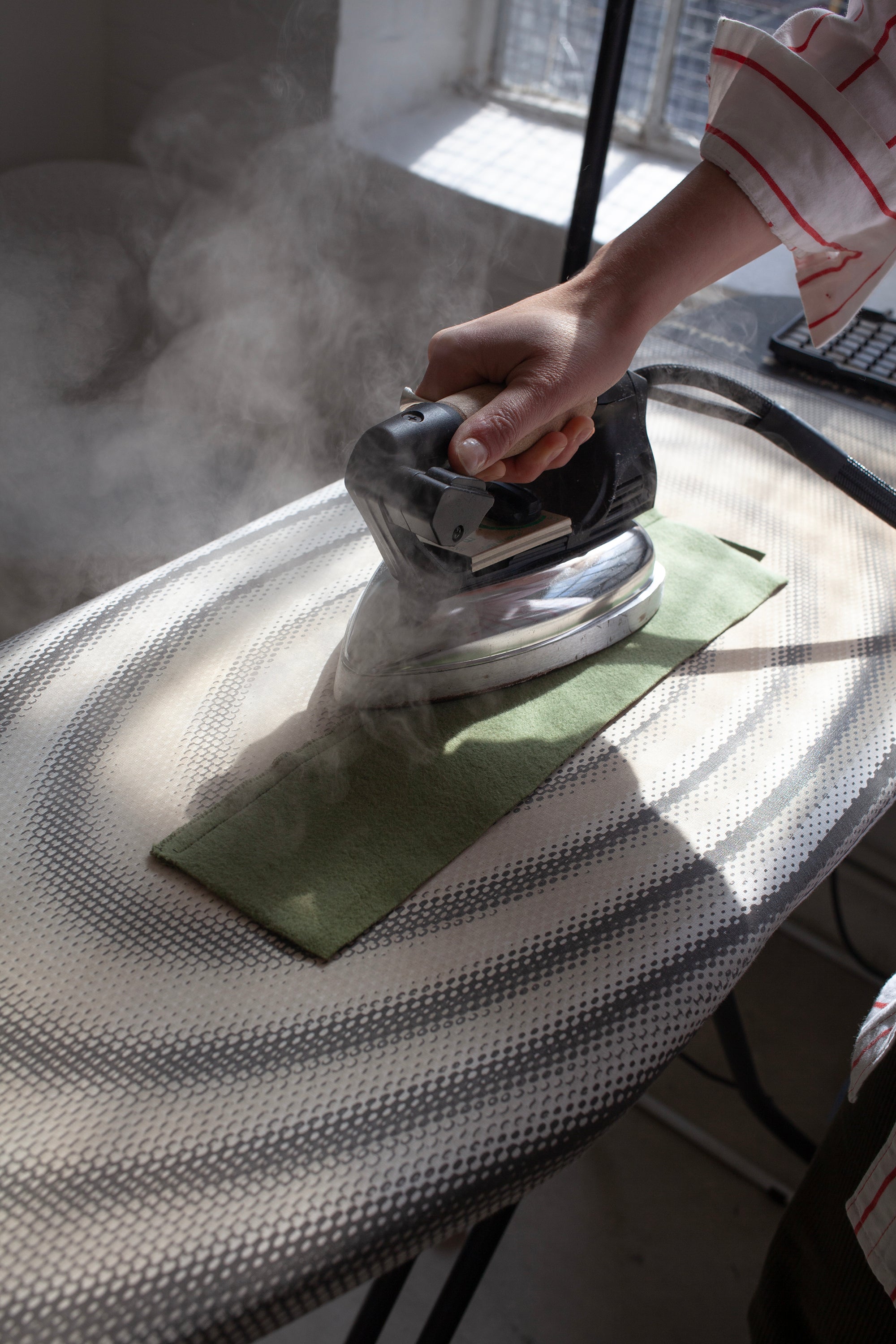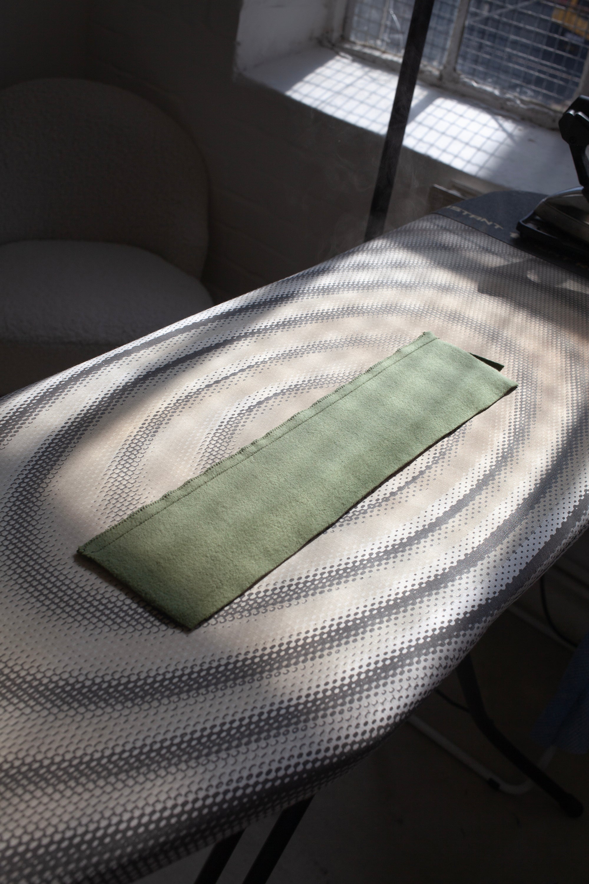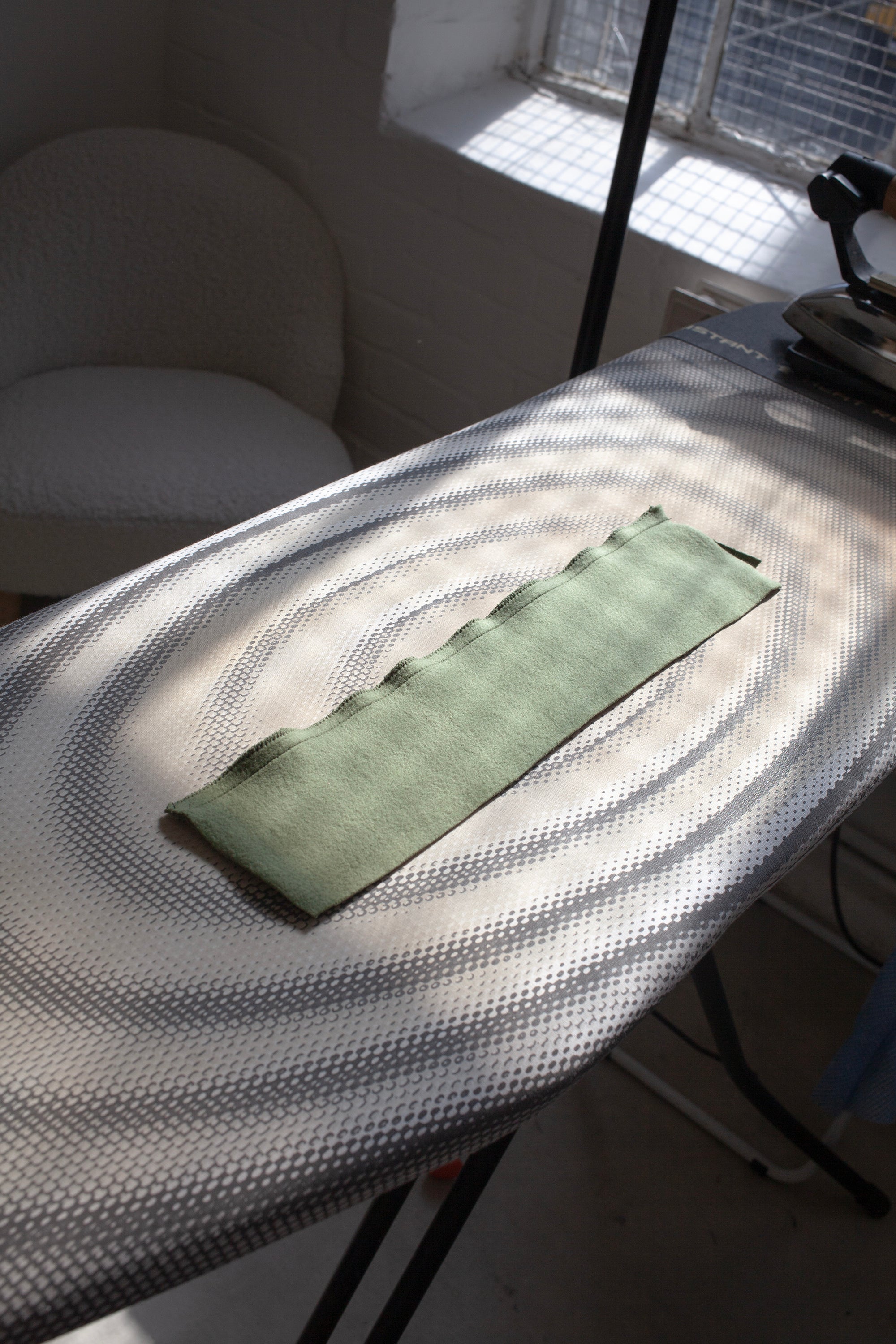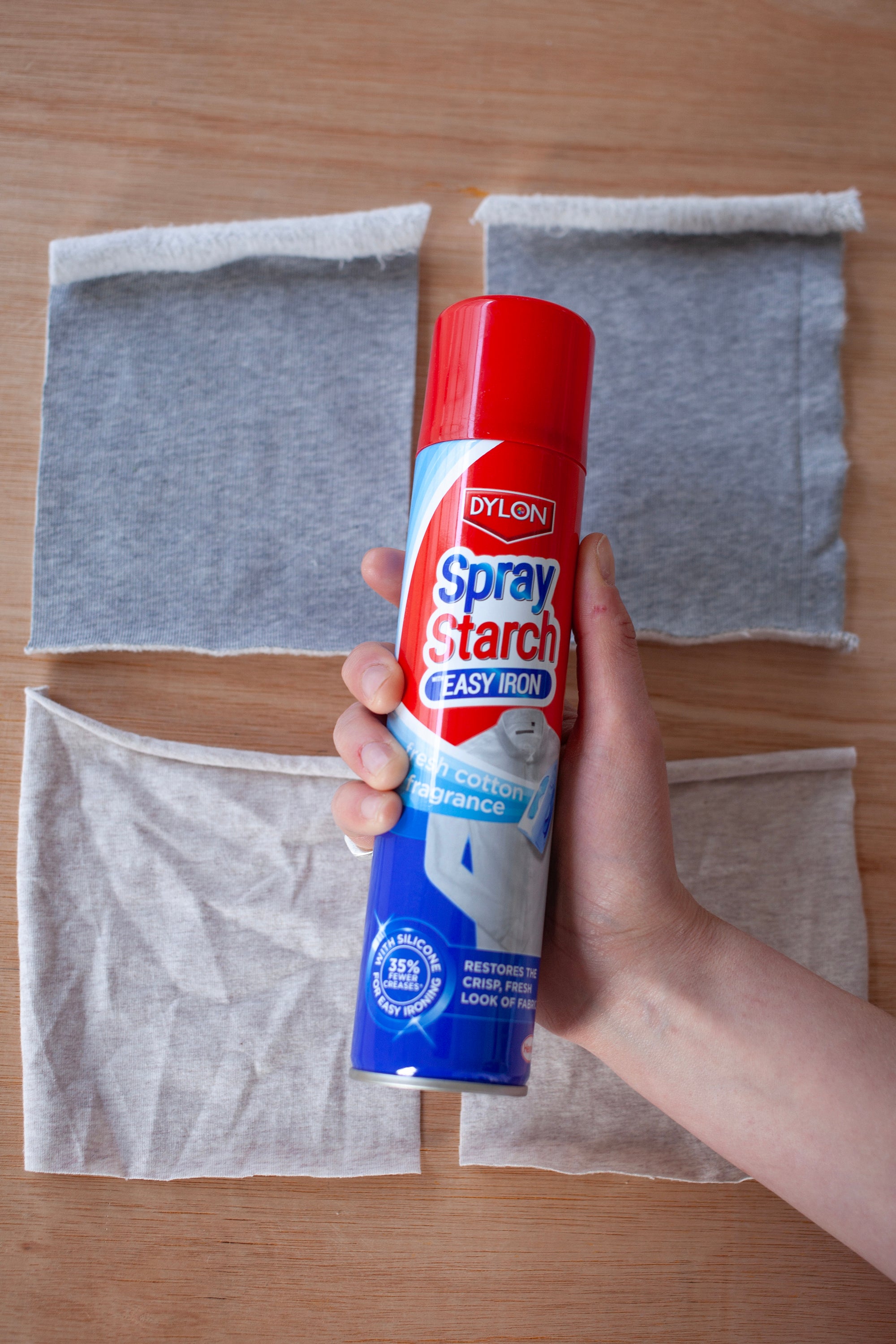 You can use a starch spray to prevent this and help keep your pieces nice and flat as you sew them. We got our starch spray for £3 at a local hardware store.