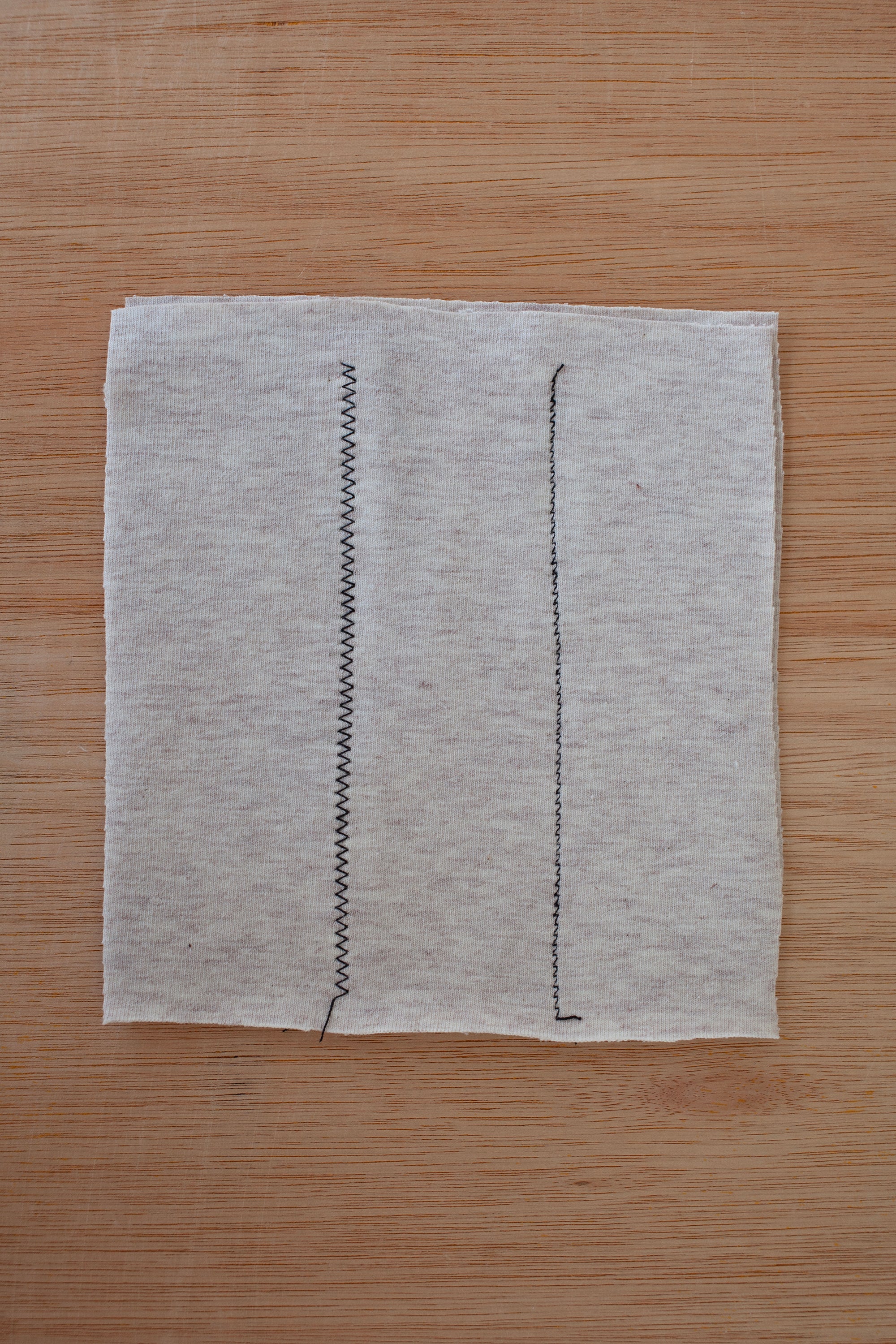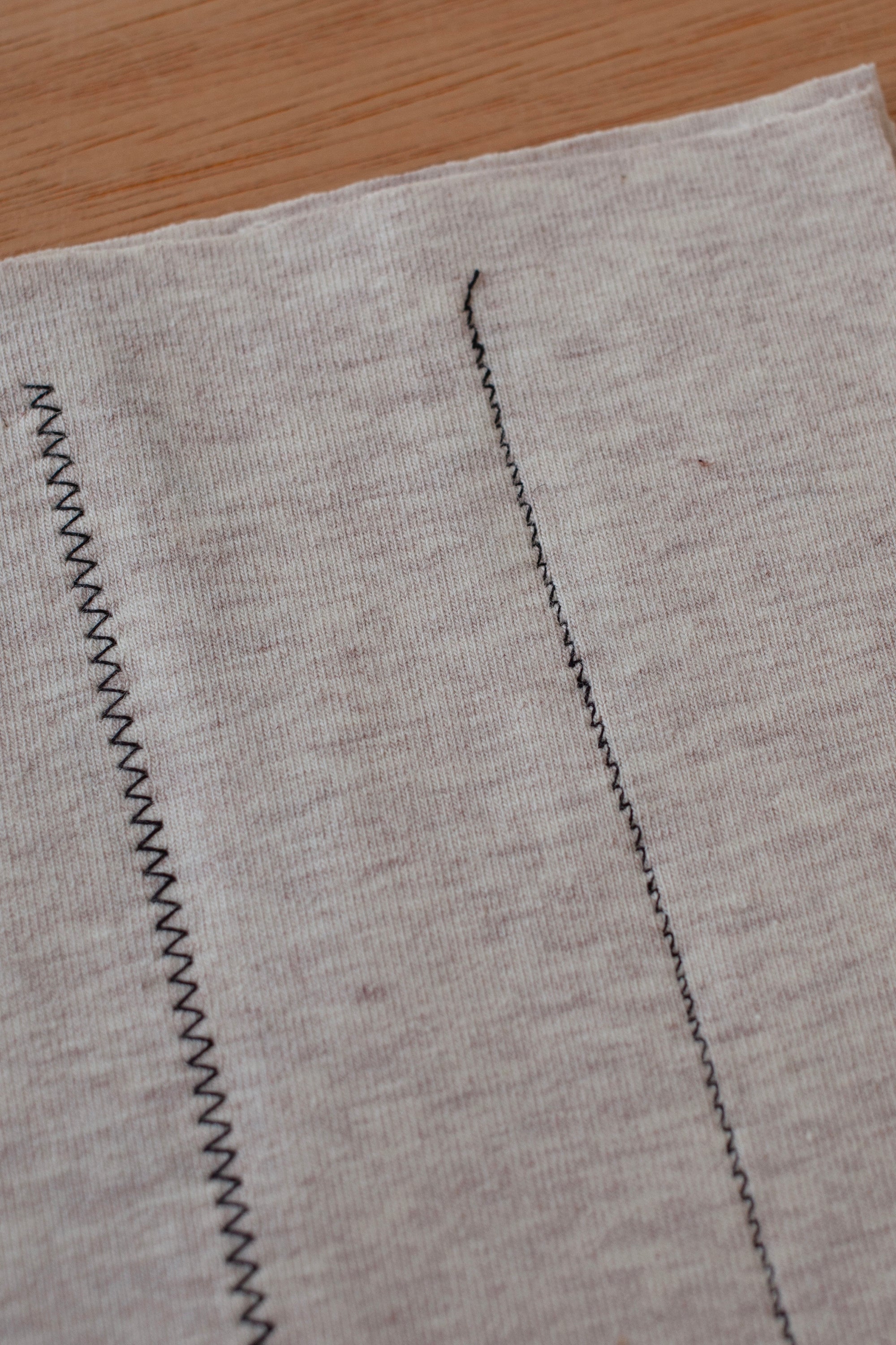 The two most common jersey stitches are zig zag stitch (on the left) and lightning bolt stitch (on the right). Always use a jersey needle or a ball point needle, they have a slightly blunt end to them which stitches in-between the knit rather than breaking through the threads.