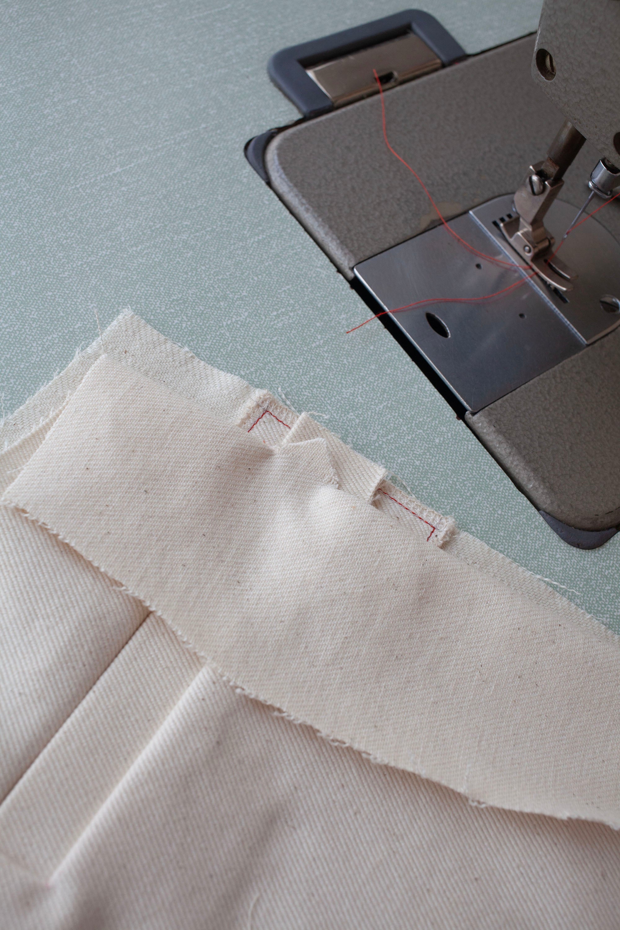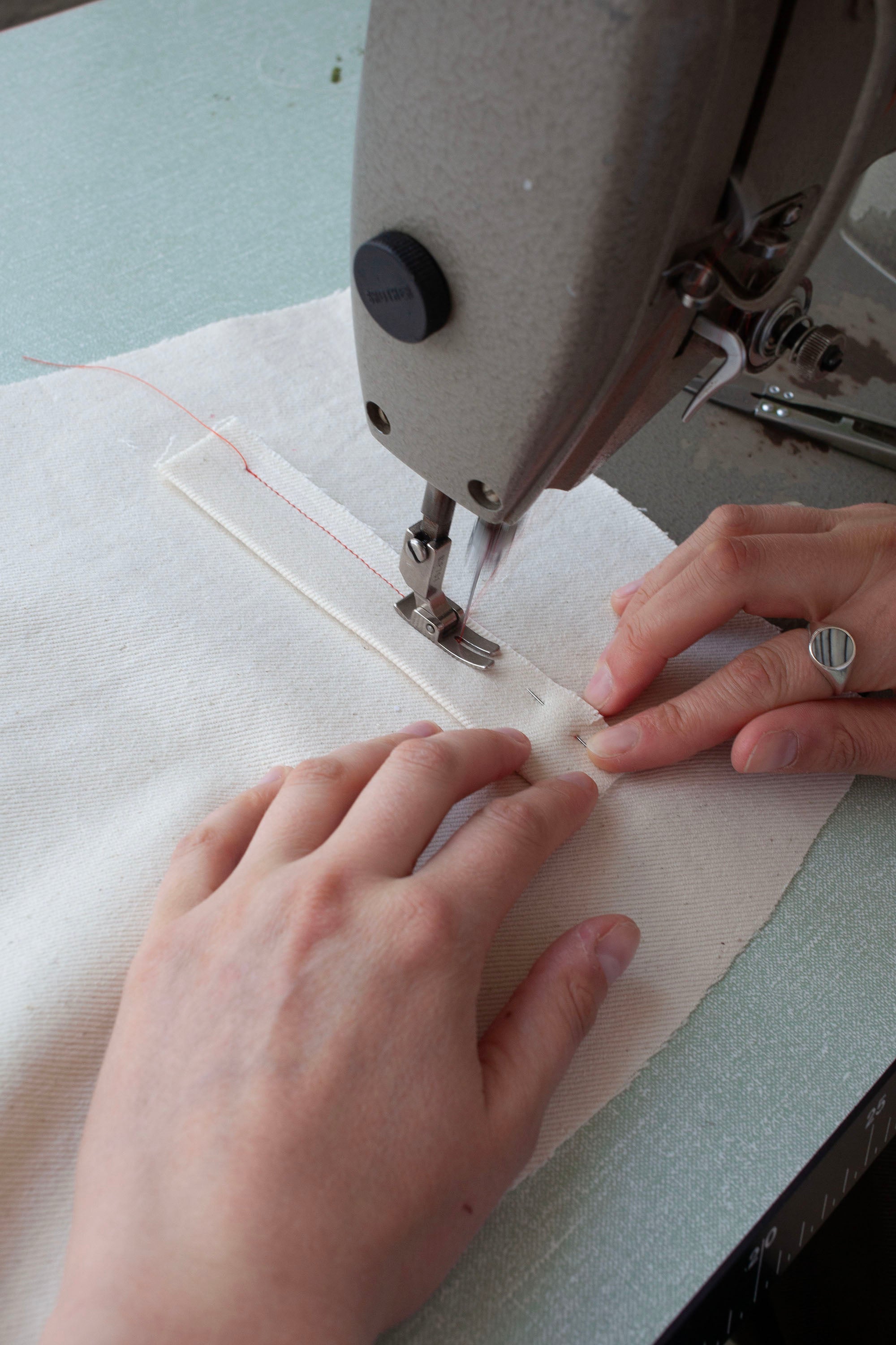 Pin into place and stitch between the dots at 1cm, doing a backwards stitch at each end. Make sure the stitching is completely straight and starting and finishing directly on the chalked dots.