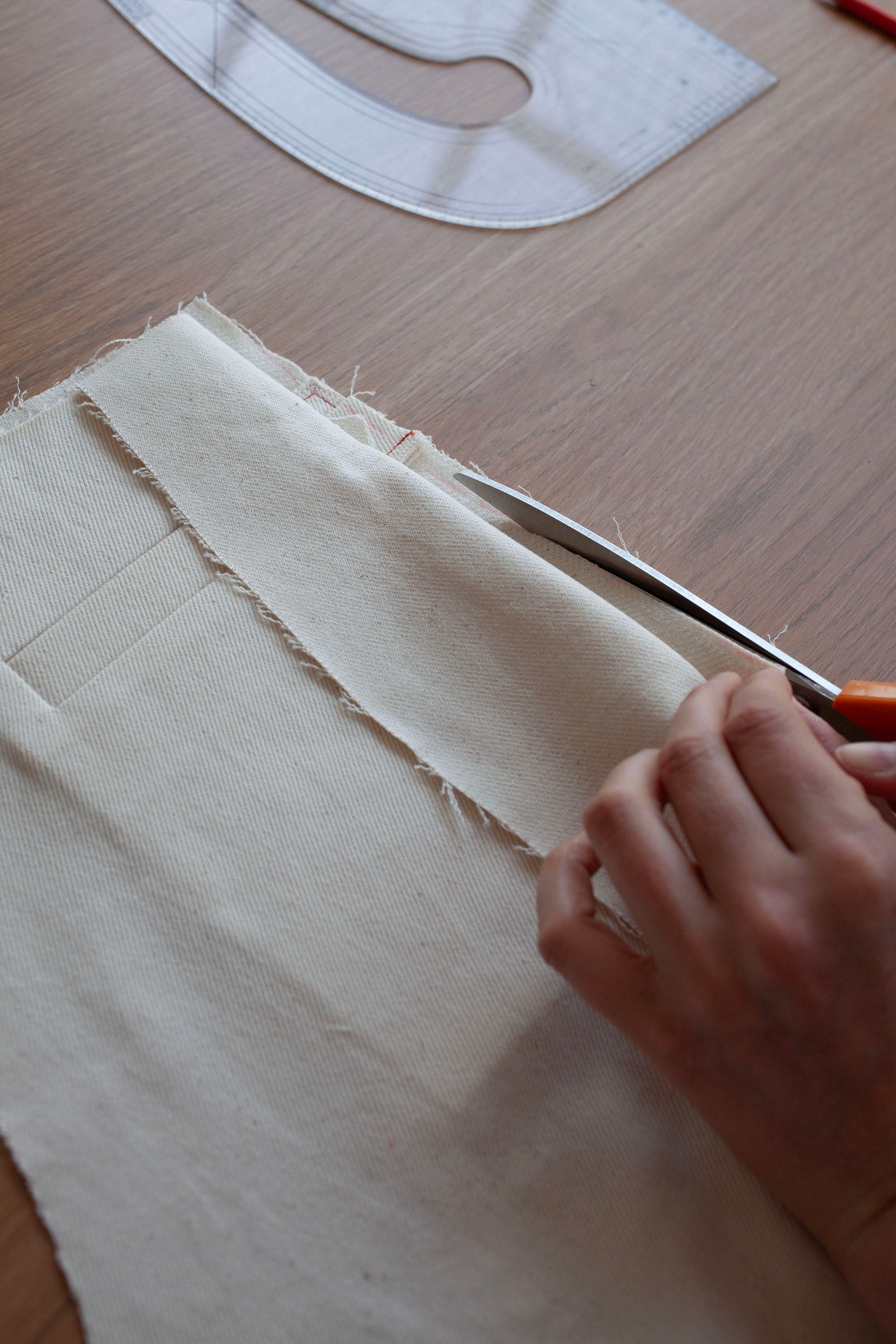 To straighten out the pocket bag shape lay the leg right side up and fold the edge of the leg over to show the edges of the pocket. Trim to neaten out any rough edges - here we’ve chalked on a straight line using a ruler first.