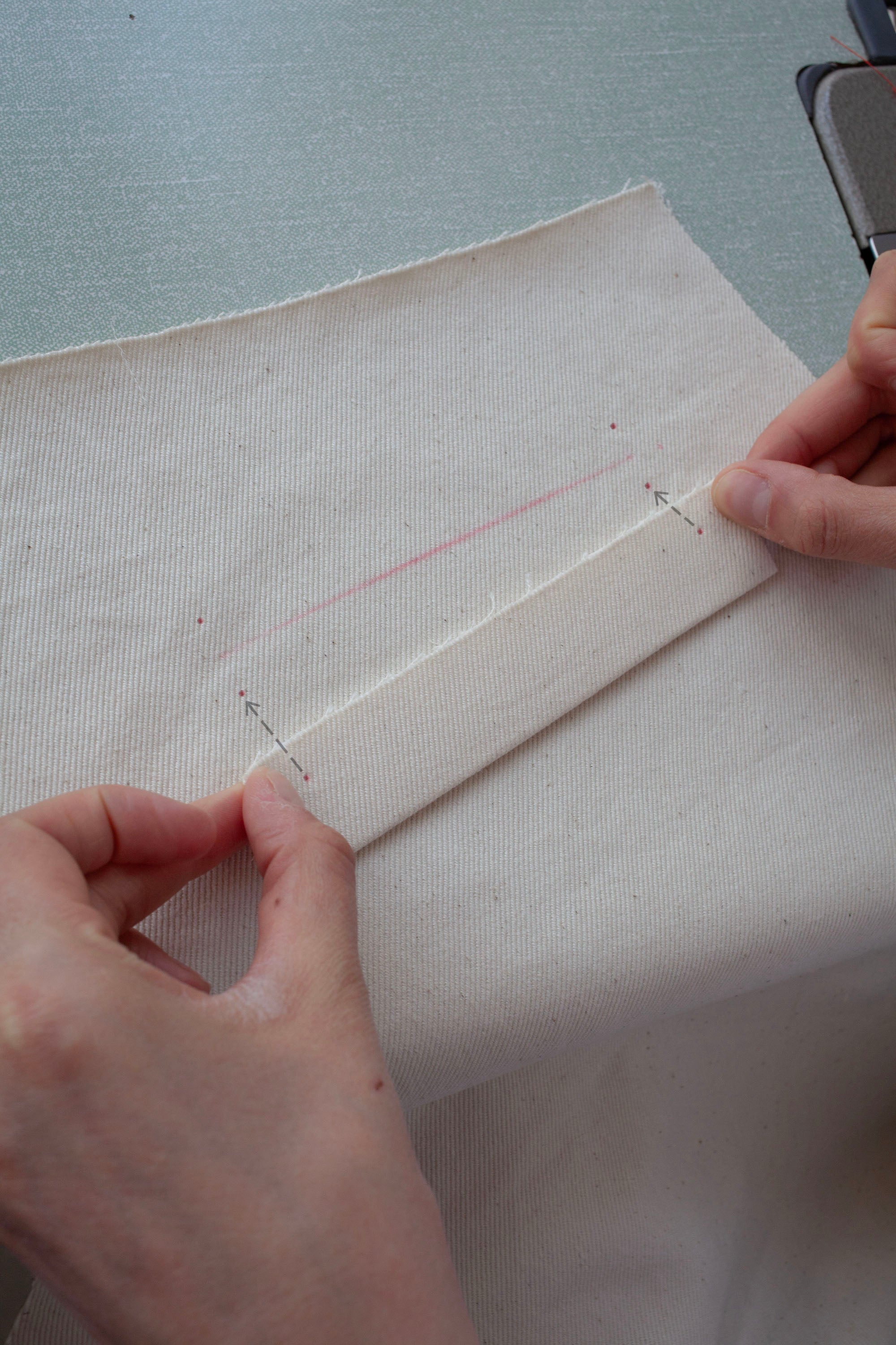 Fuse your welt piece and press in half lengthways. Then place a chalked dot as marked on the pattern. Place the raw edges of the welt against the chalked line with the fold facing down. The chalked dots should be lined up underneath one another.