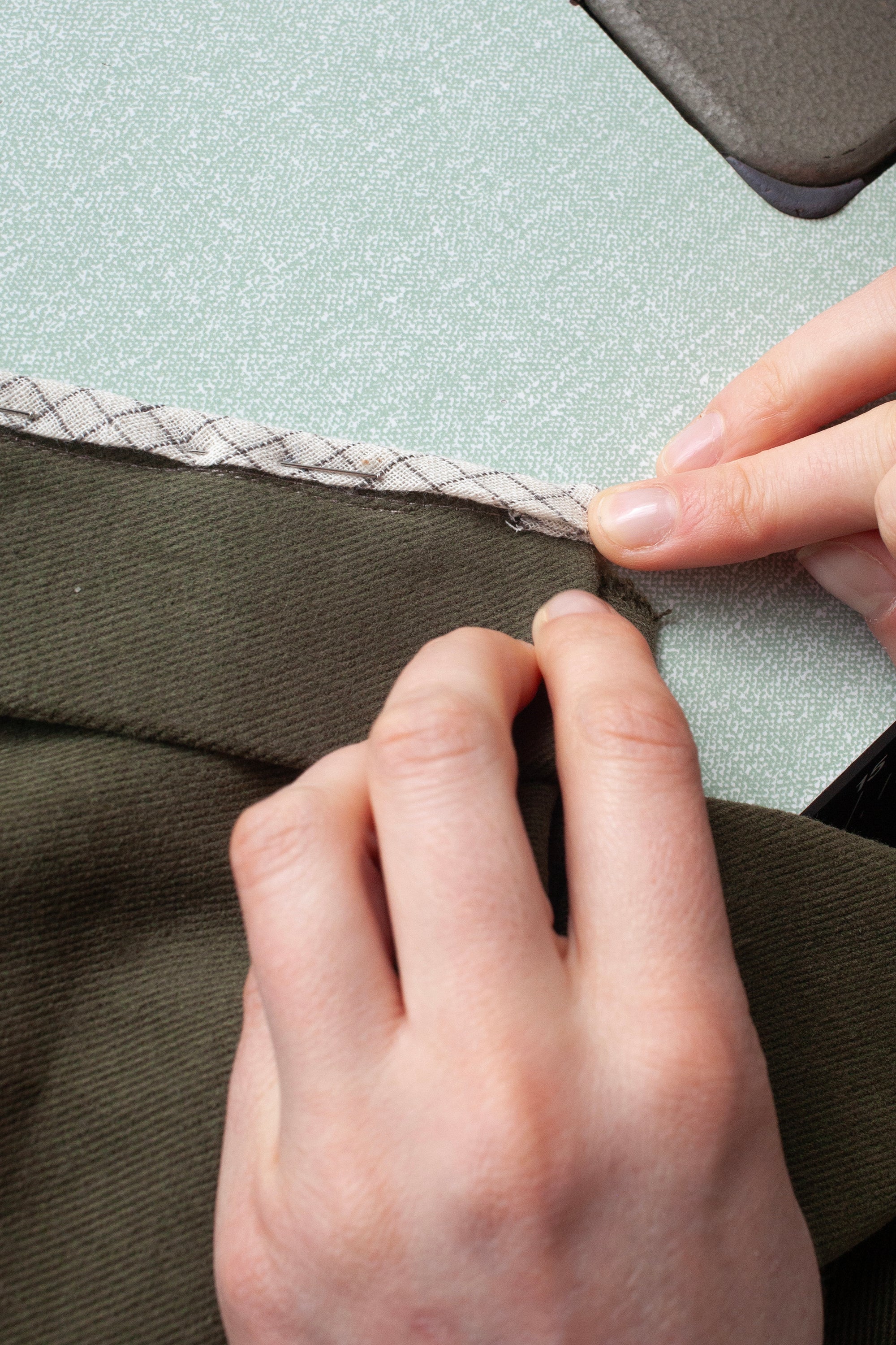 Now lay the front trouser flat and pin the facing flat against the front leg. From the inside of the trouser stitch around the curve of the facing. It’s easiest to start at the top and carefully make your way down around the curve, going nice and slowly to get a smooth stitch line.