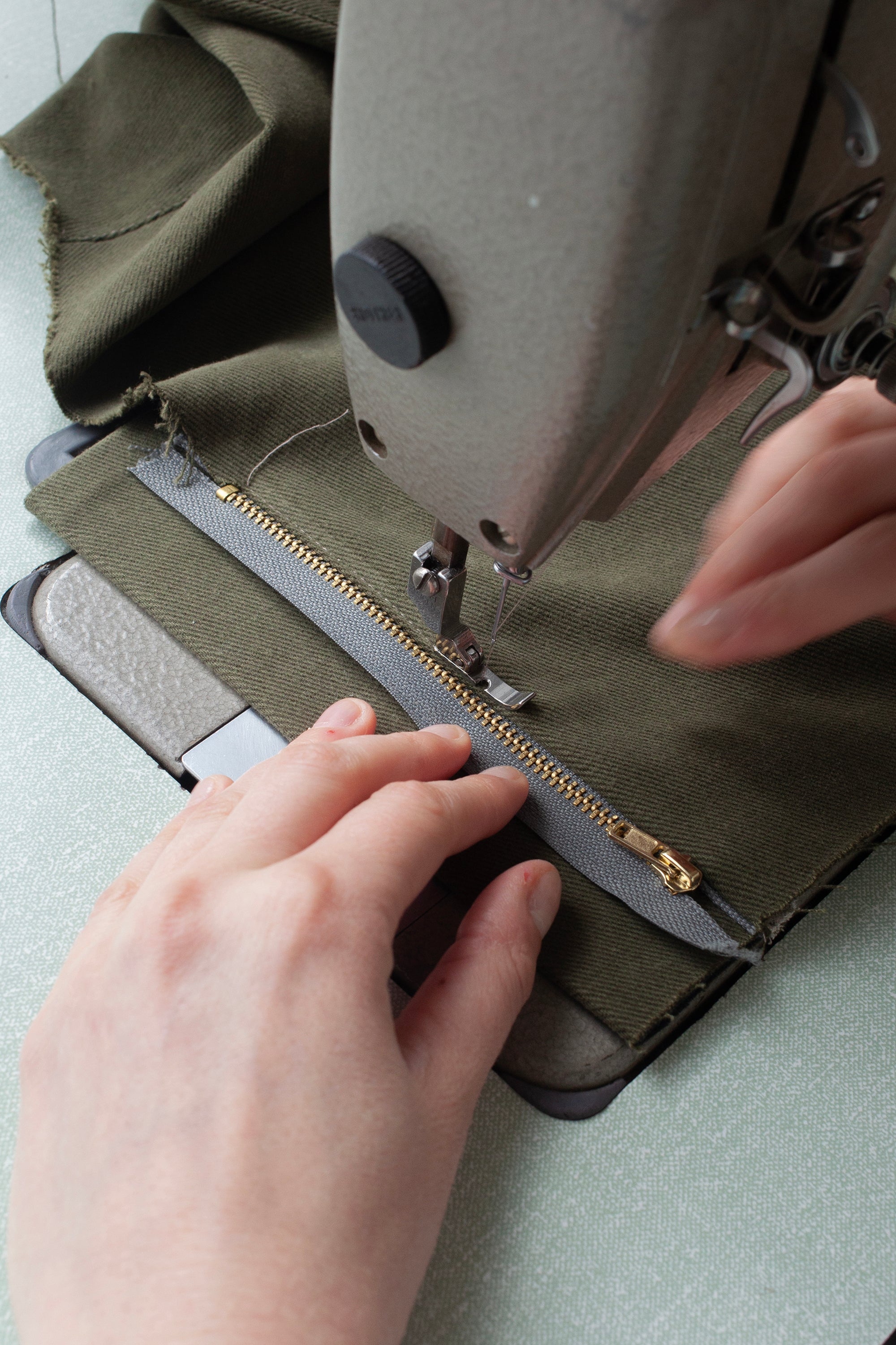 Once the position is confirmed you can then stitch the zip to the facing using the zipper foot to get close to the teeth. Make sure you only stitch through the zip and the fly facing and not the trouser leg too.