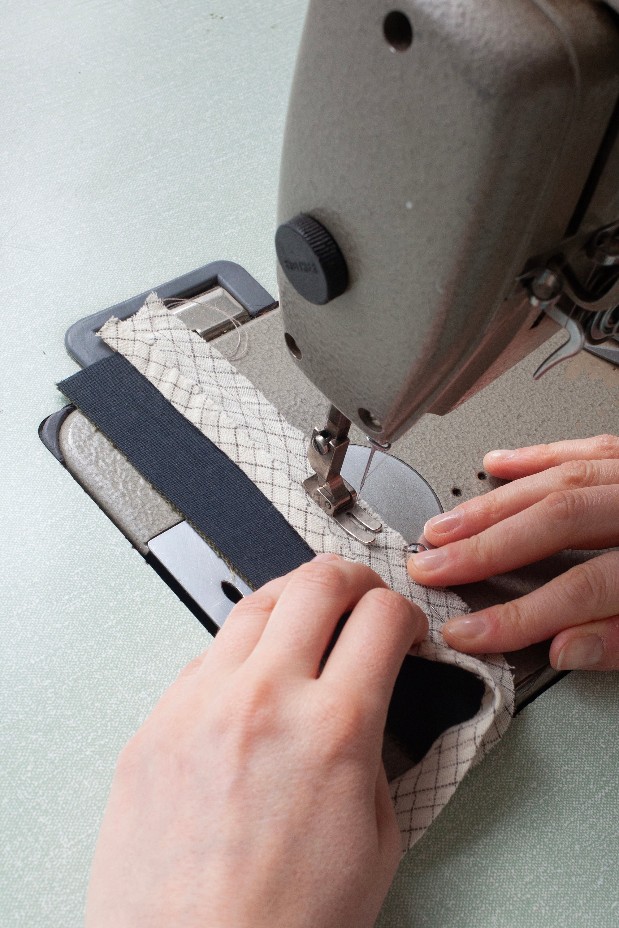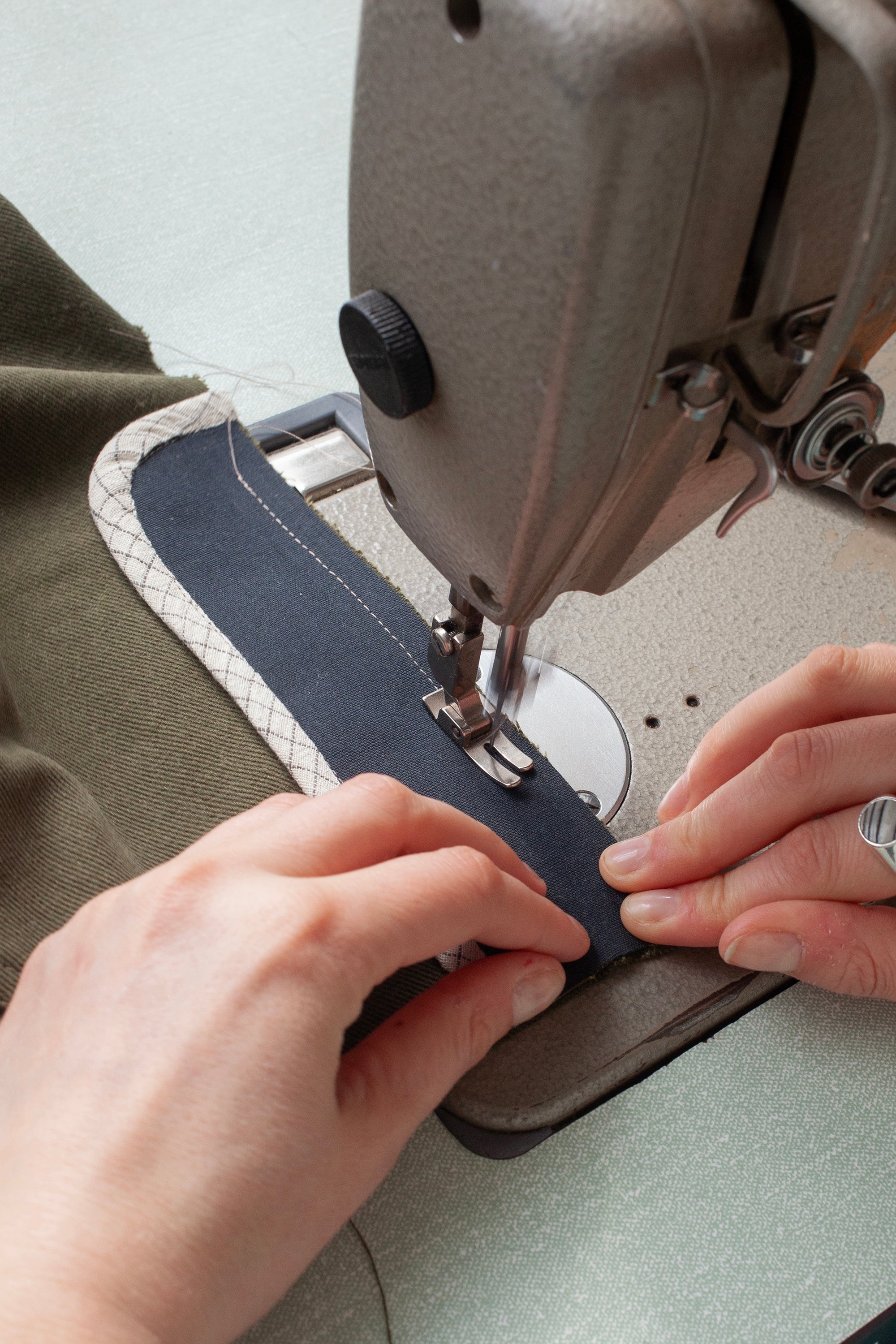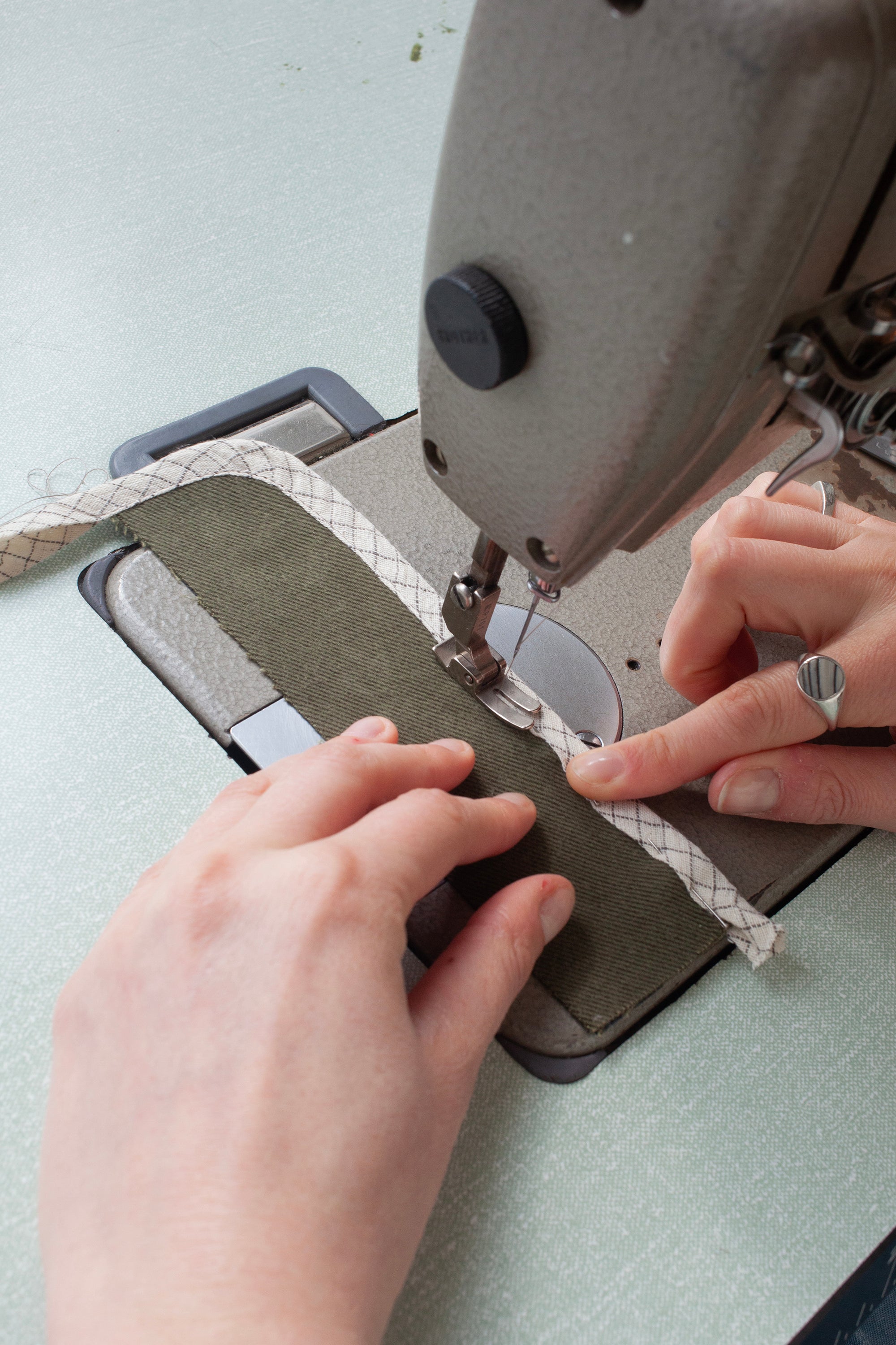 Then edge stitch the binding down - take this nice and slow, making sure the binding is nice and parallel with no tucks or twisting.