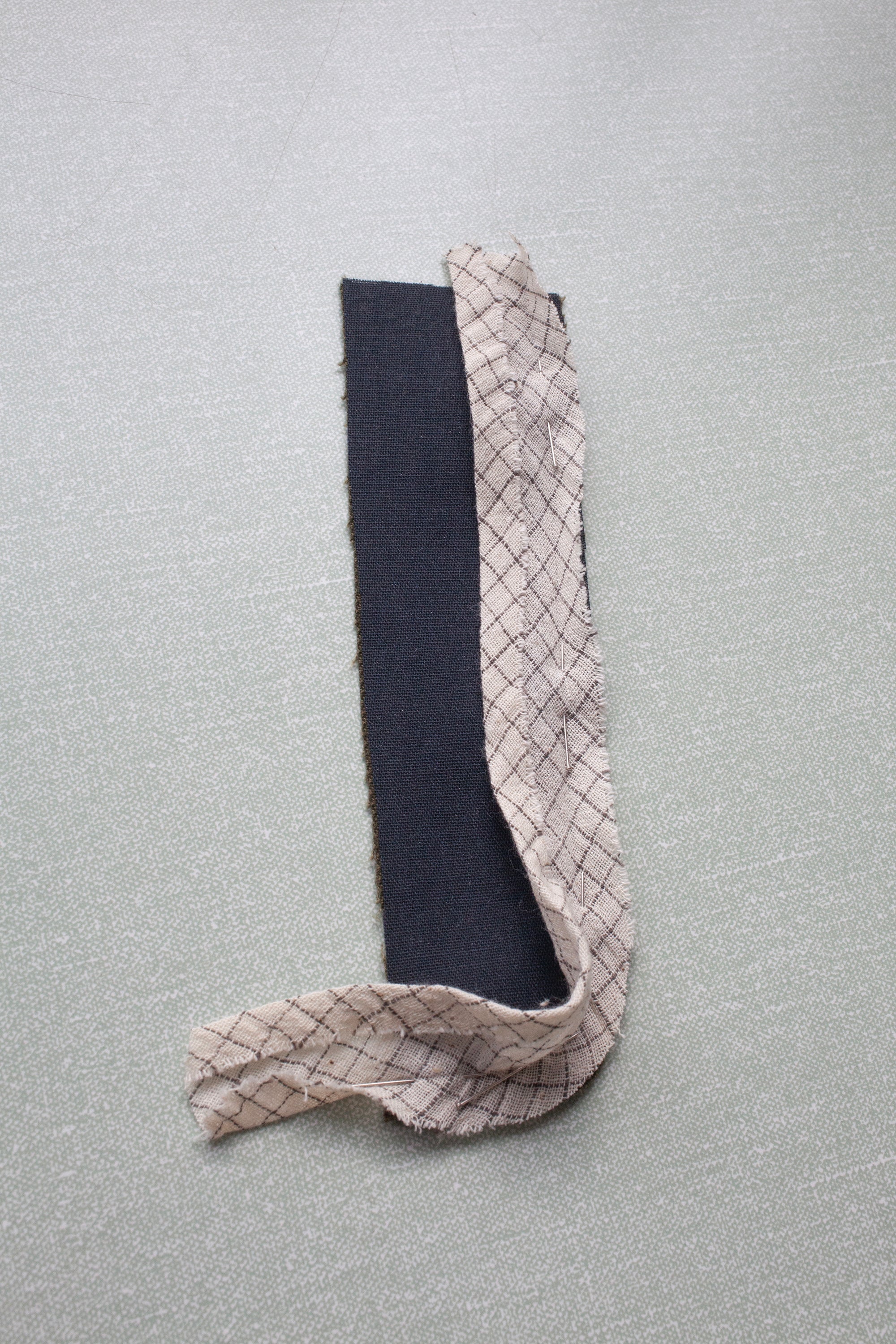 To prepare your binding press it into place by folding the outer edges in to meet in the middle. Then cut roughly into thirds and save two pieces for later.