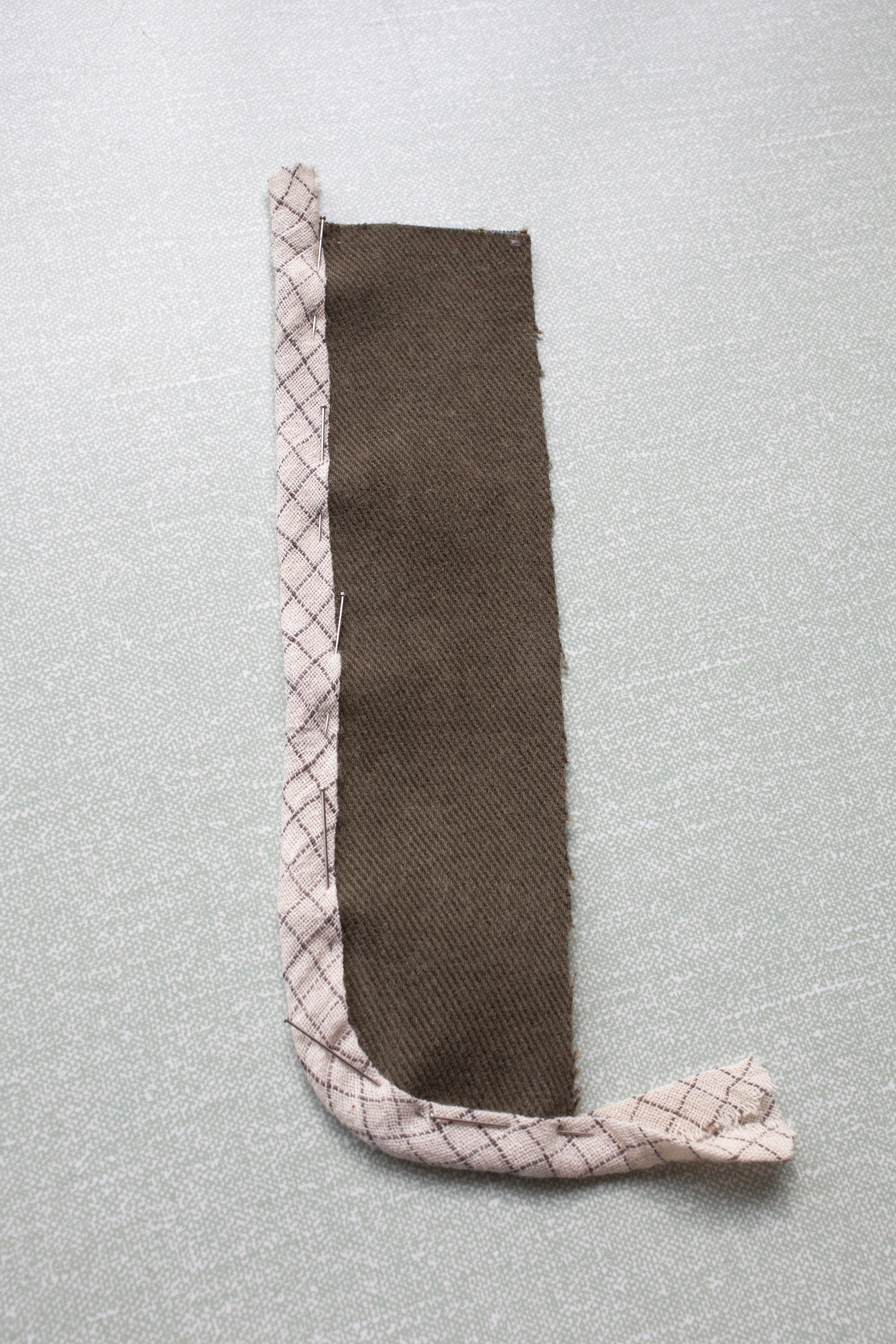 Lay the fly facing in front of you RIGHT SIDE DOWN. Lay binding on top of the fly stand with the RIGHT SIDE of the binding against the WRONG SIDE of the facing.