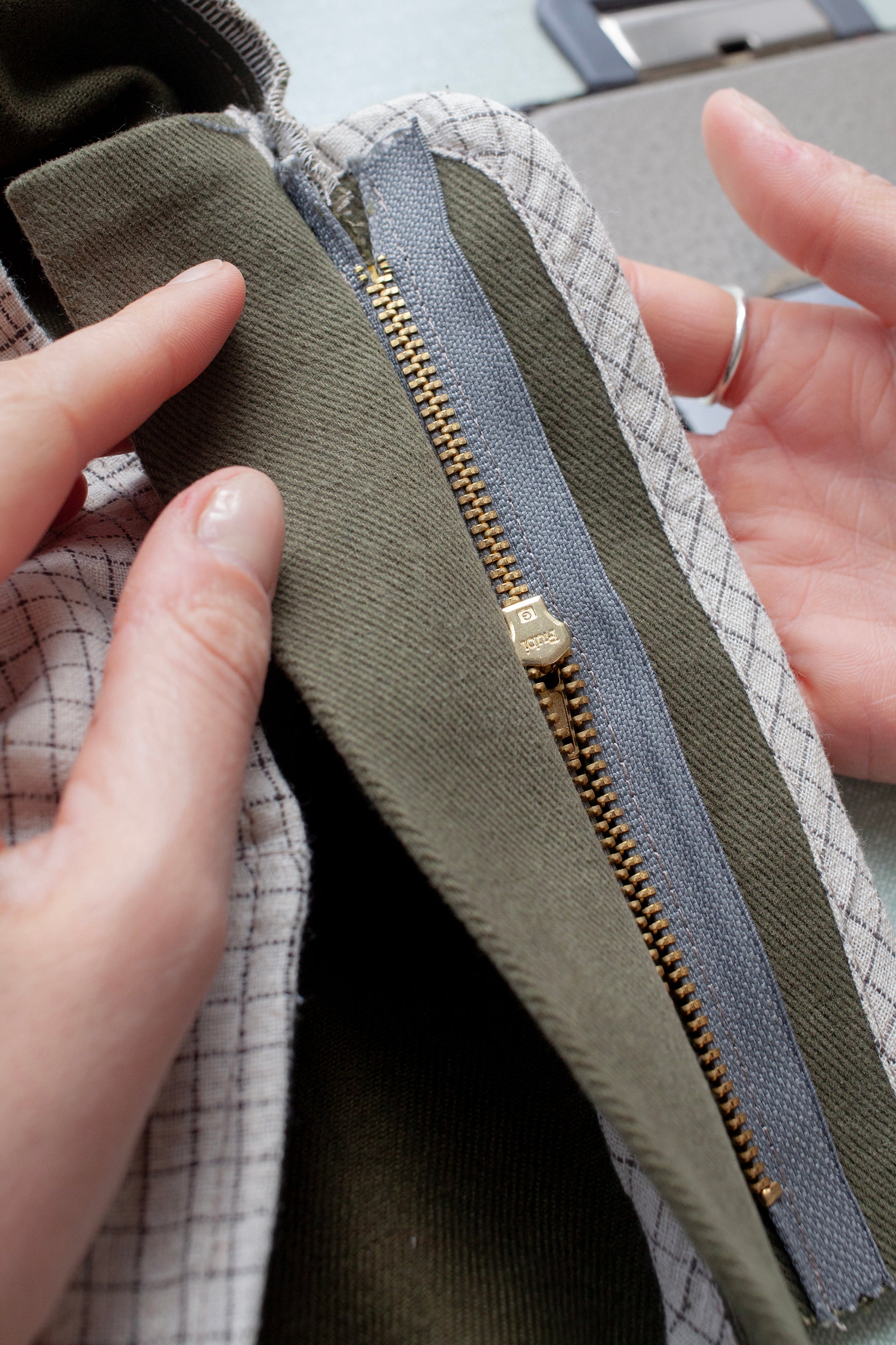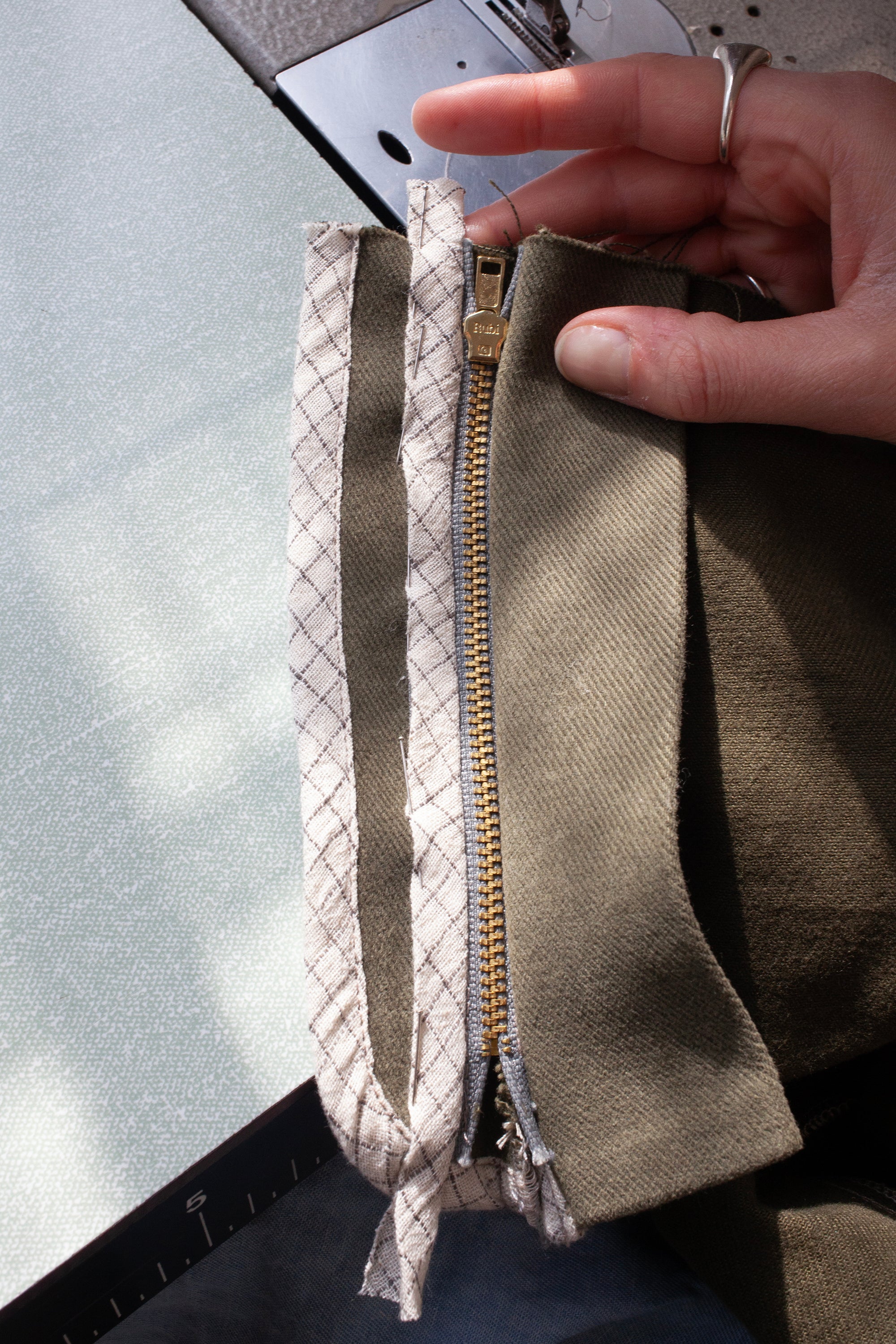 To secure the second half of the zip, lay the fly area flat with the left front overlapping the sewn zip side by at least 0.5cm. Reach inside and while holding the fly facing down, peel back the rest of the trouser and then pin the loose side of the zip to the fly facing without pinning the zip guard. Once you’ve pinned it lay everything flat again to check the position before sewing.