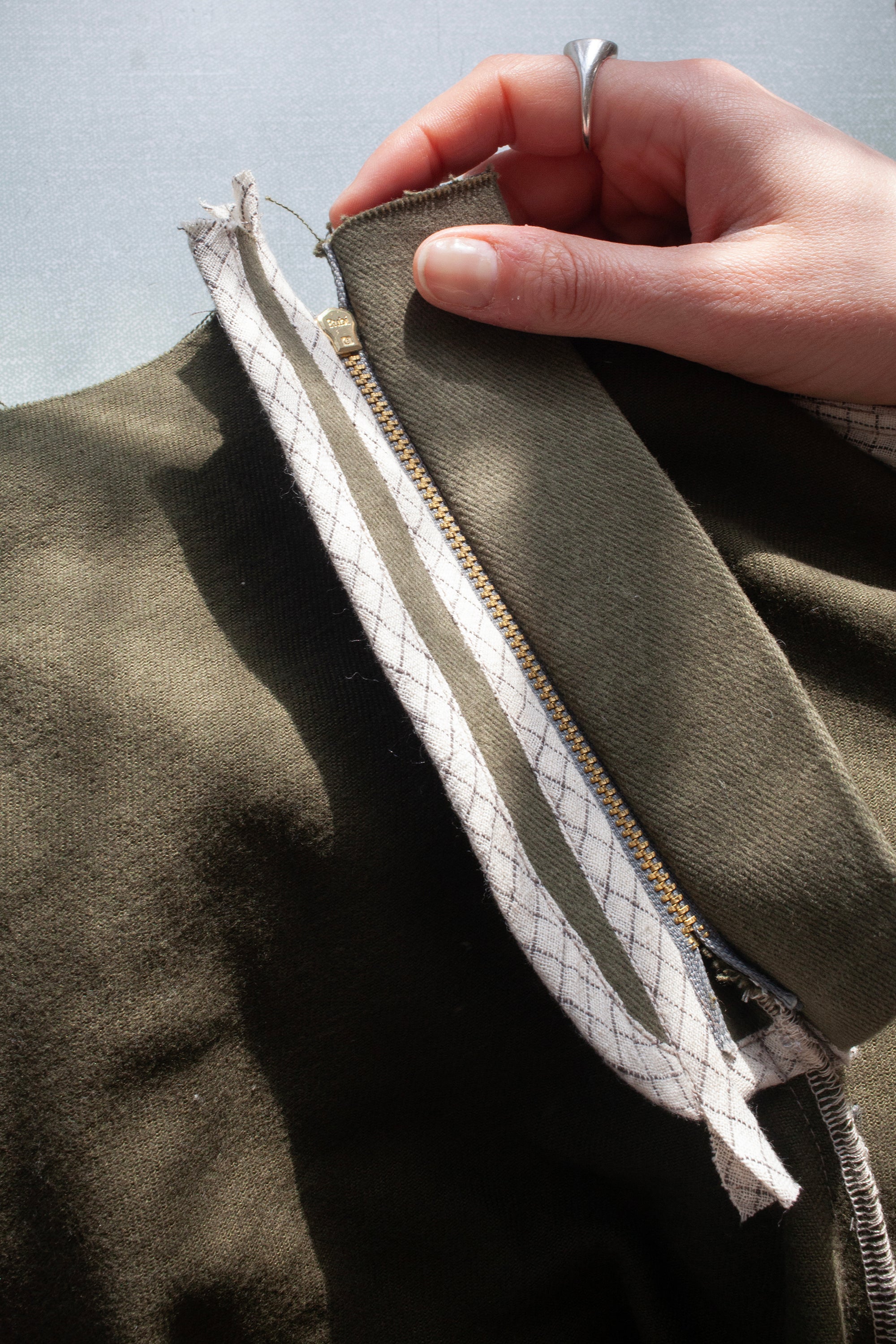 Then fold the binding so that the free raw edge meets the line of stitching. And then fold it once more so that the whole binding is flat and covering the zip tape with all the raw edges concealed inside.