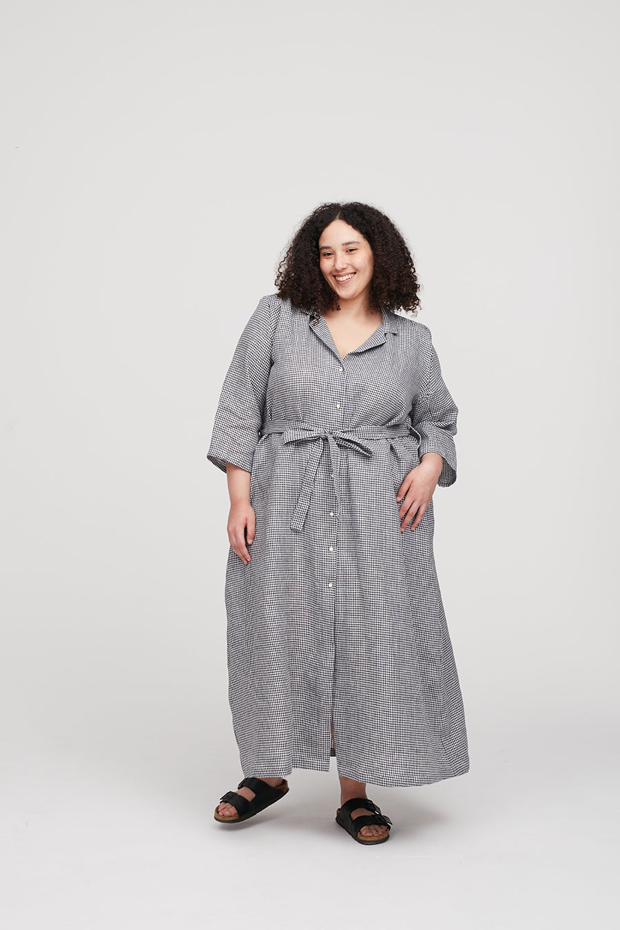 The Celia Dress is fitted on the shoulders and features an a-line cut with plenty of room for comfort and movement. The shape is forgiving from the bust down so it’s just about making sure the bust and shoulders feel good. The two-piece sleeve is three-quarter-length and the style comes with an optional belt.