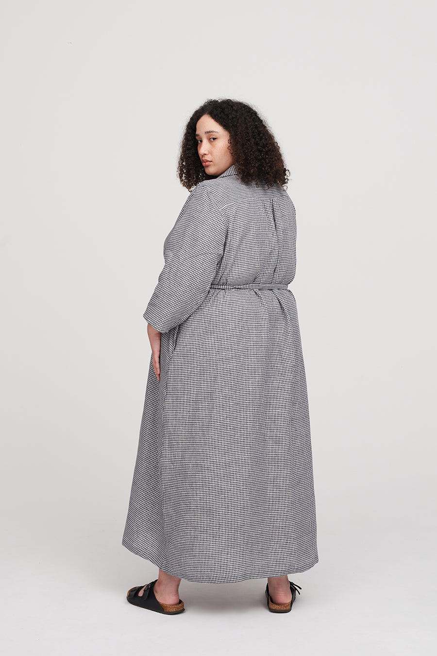 I made this dress out of a large check shirting in black and grey. I love how it fits; it's loose in the back but fairly slender in the straight-on front profile, which is flattering. My only difficulty was in understanding how to insert the side seam pockets. I have probably done this 20 times in my life, but this technique was different and though I am an experienced sewer, I just couldn't solve that. I ended up making big patch pockets, which looks great, and if I make it again, I'll just insert the side pockets the way I know how. But in the end, it is a simple, flattering, and straightforward make and I do recommend it. I would also add that it might be helpful to have a double notch marking the back of the sleeve as it was a bit tricky knowing which side of the sleeve was front and which was back just by looking. I pinned it in both ways and made the choice that worked best and it is fine. When I cut it out next time I will differentiate the notches for myself. All in all, I good keeper pattern!