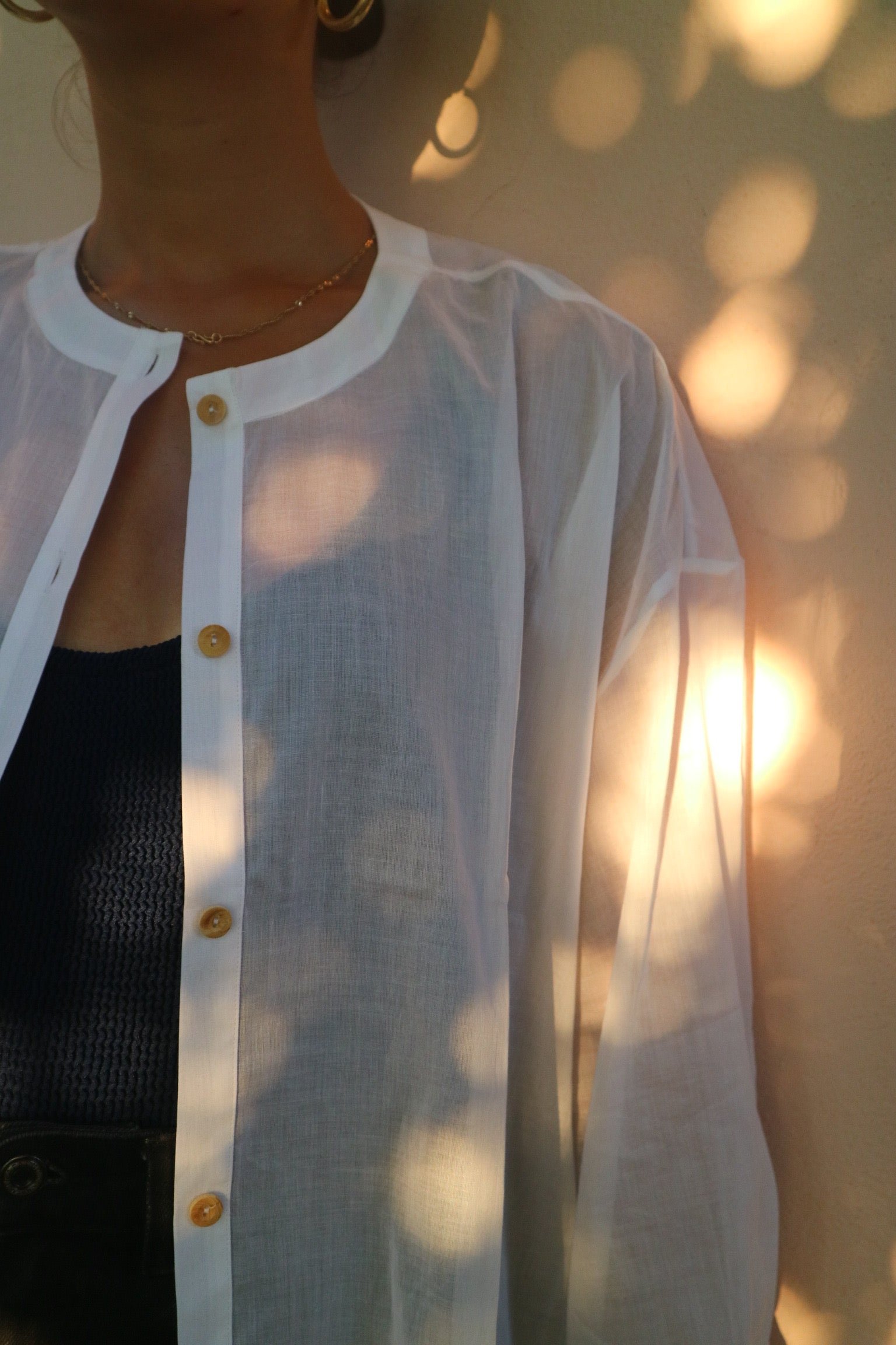 The Leila Shirt is a loose fitting shirt that feels simple and elegant. This cut features a very dropped shoulder with an exaggerated roomy fit around the body, full sleeves with an extra long placket and back gathering details. It's a perfect piece for the height of summer for a breezy feel that covers the skin.