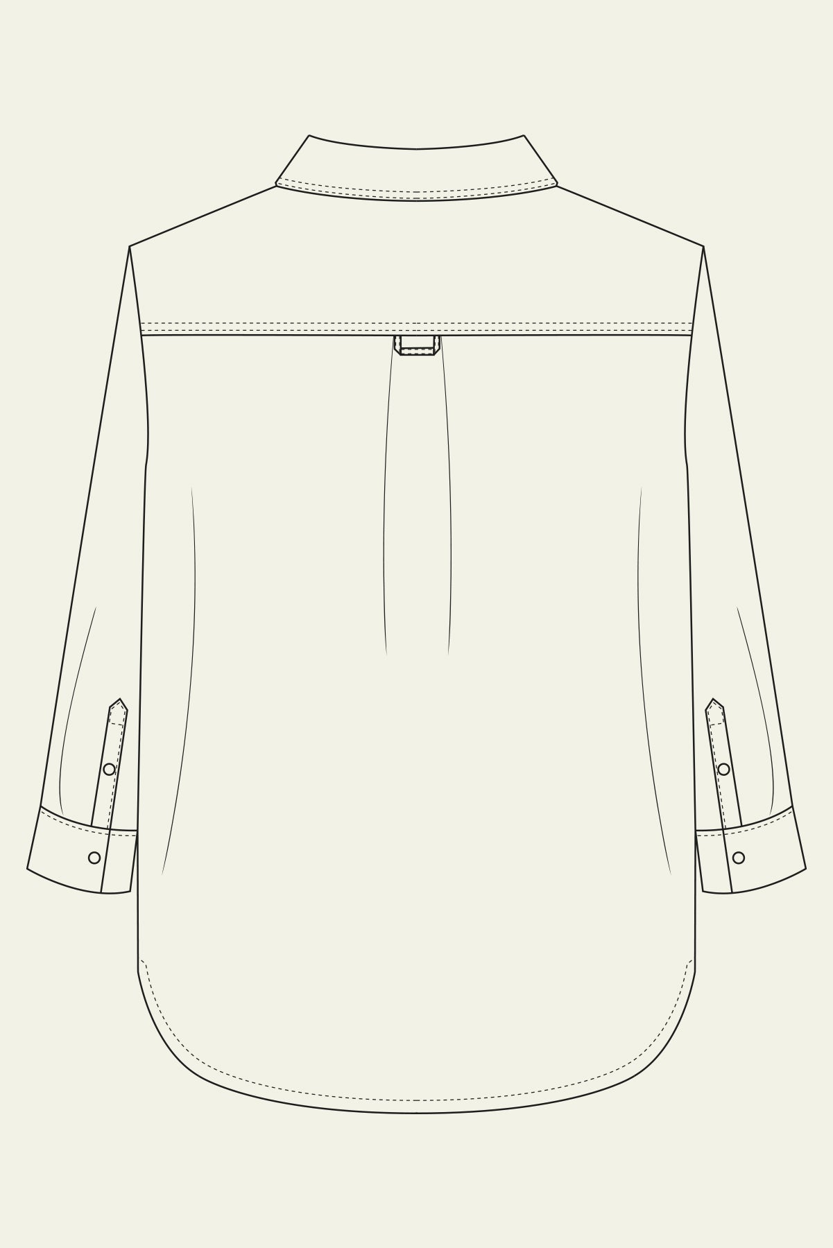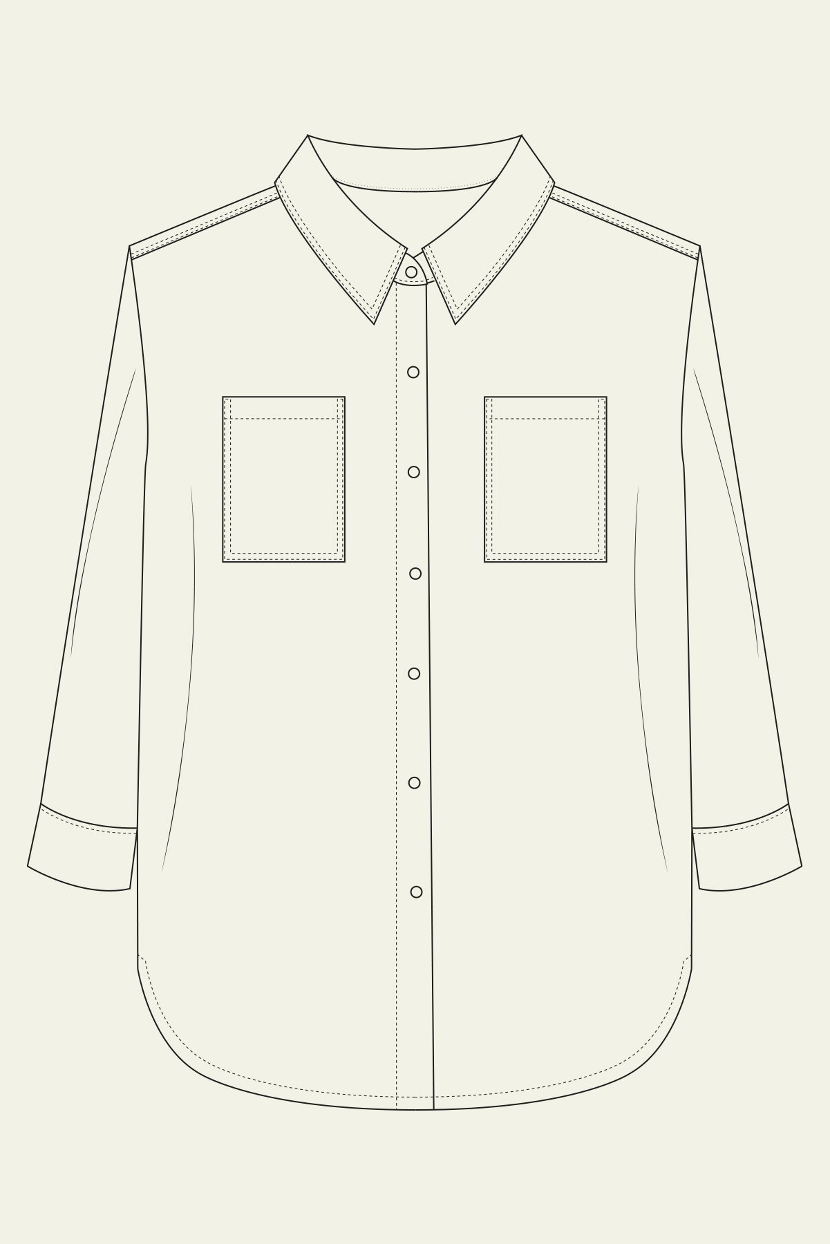 This is a classic style shirt with a neat but fairly broad shoulder and a very straight torso. Instead of narrowing towards the hips like typically male shaped cuts, there is slightly more room to accommodate the wider hip of more female body shapes. This pattern comes with 3 different sleeve length options.