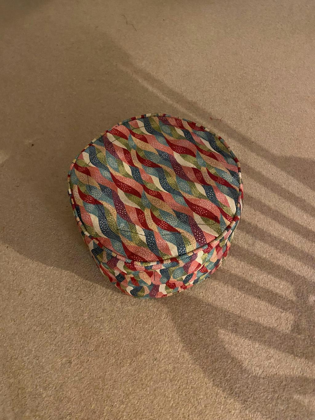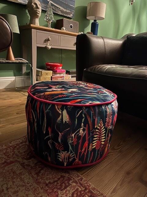 I thoroughly enjoyed making this pattern. It took just a few hours, not including cutting out the fabric, and the end result is really satisfying. The instructions are so clear and I really appreciated the thought that was put into making the project work with just 1m of wadding. The piping and the wadding give it a really polished look. And I managed to fill it with two large bags of fabric scraps! I love the way my pouffe looks and it makes a really great footstool. I’ll definitely be making this again.